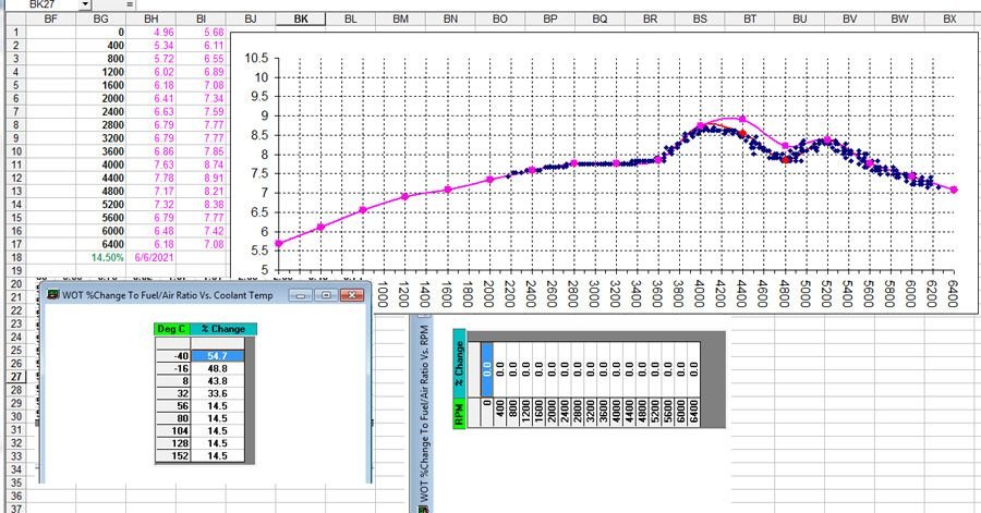 I like to keep the tuning simple for me to understand, so I zero out the WOT% vs RPM table, set the WOT% table to 14.5, and do my injector pulse tuning in the tables.