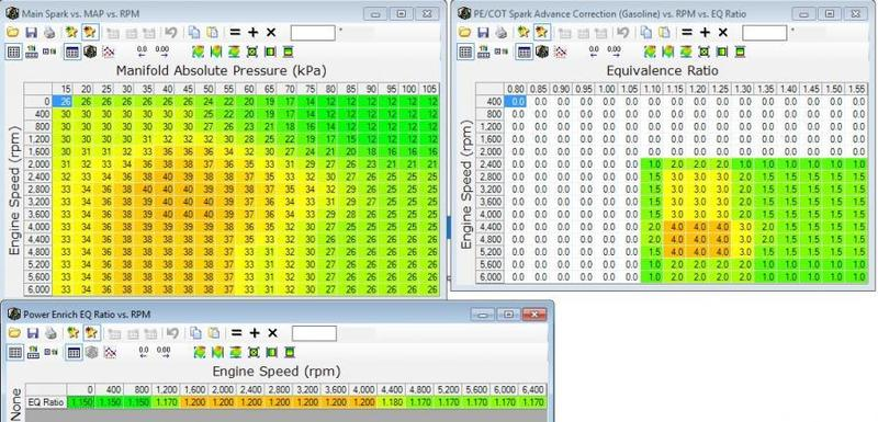 I should have also stated before the EQ ratio stuff is equivalent to PE. Take the 1.15-1.25 row that is all the same value and put it into the PE table. Some like to eliminate the PE table by zero'ing it out, then wonder why they get knock retard under load outside of PE and back off the higher map spark advance because they are getting knock retard when the chambers are burning the hotest at stoich. The added fuel in PE cools the burn and allows a bit more timing. Typically at a Equivalence of 1.15, most engines like 2-4* more timing than they can run at the same load operating at stoich. Funny but true the 11:1 aluminum head 383 currently in my Express van runs a similar timing map. It has a touch more timing up top, saw 32.5* this evening at 5,500 right before it shifted 2-3 @ 90 mph in 100F ambient temps detonation free on 91 octane that has been in the tank for 5 months. Drove it to burn some old gas out of it and get everything hot and moving.