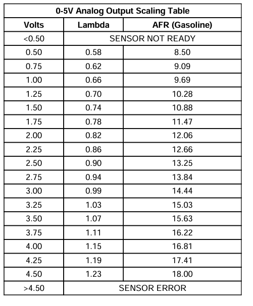 7.) Grab the WB O2 instruction sheet that came with your WB gauge and look up the table for voltage vs gasoline AFR. A sample table below...