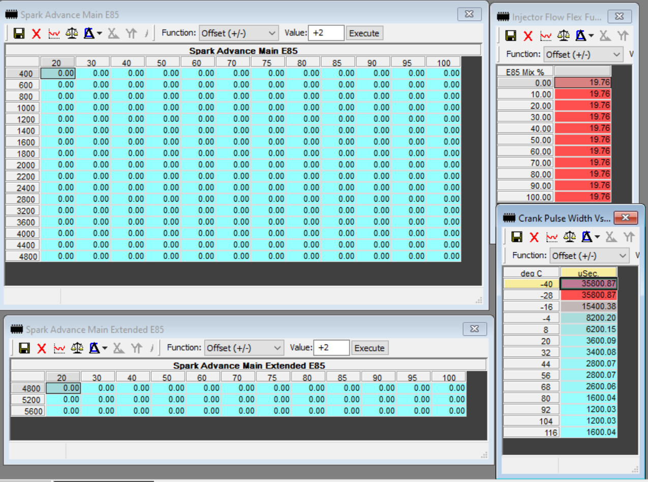 Main Spark timing E85 and Extended Spark Timing E85. These are to have Full E85 timing values. (blended by ECU based of Manual blend ratio entered.)