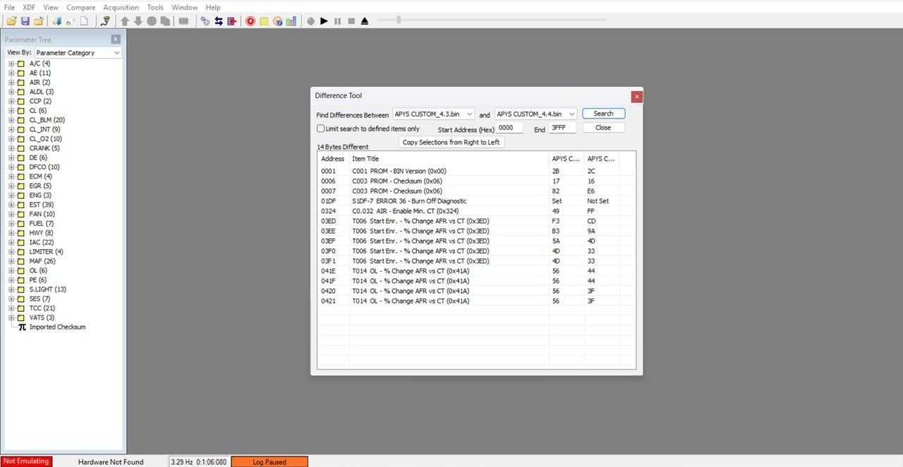 Screen shot of "compare" feature on Tuner Pro RT, between version 4.3 and 4.4
