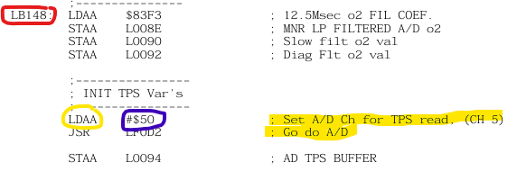 find where the ecu reads the tps sensor itself. It loads $50 then jumps to a subroutine to read the analog voltage. Then it will staa or stab to a new ram spot. Thats TPS A/D your raw tps signal.