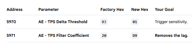 But it seems to be related to calculating AE on the delta between the raw and the lag filtered value of the TPS... not necessarily how fast the ECM is reacting to the raw value in the first place. Unless that's a non-sequitur and this whole notion I have is a wild goose chase.... lol.
