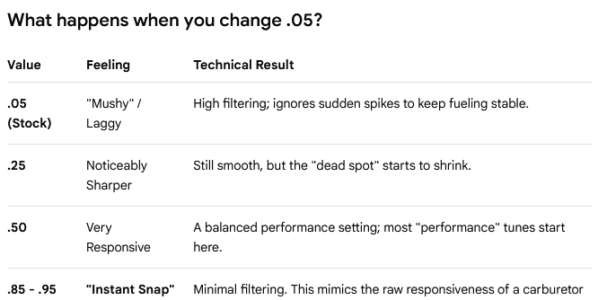 A value of 0.05 (Lower): The filter is "heavy." It only takes 5% of the new sensor data and blends it with 95% of the old data. This creates significant digital lag because it takes many processor cycles for the ECM to "believe" your foot has moved.