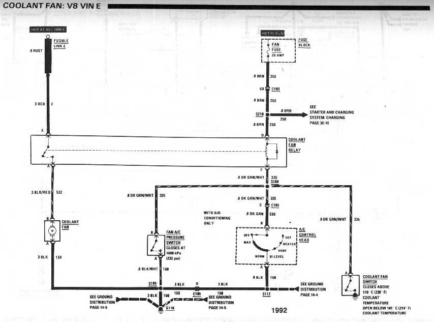 Fan power comes direct from battery through fusible link; only the relay control side is from fuse block.