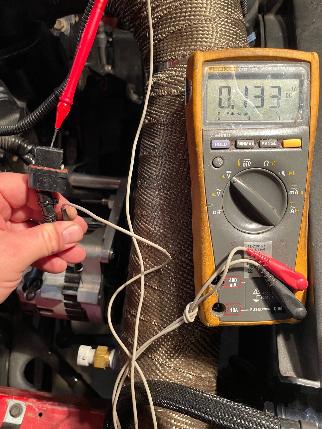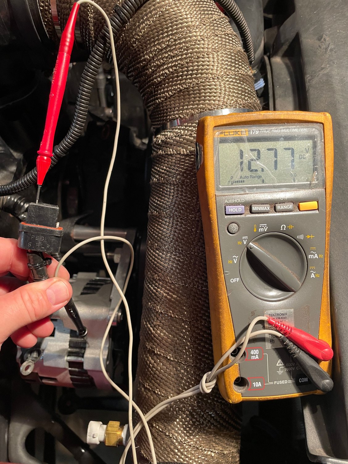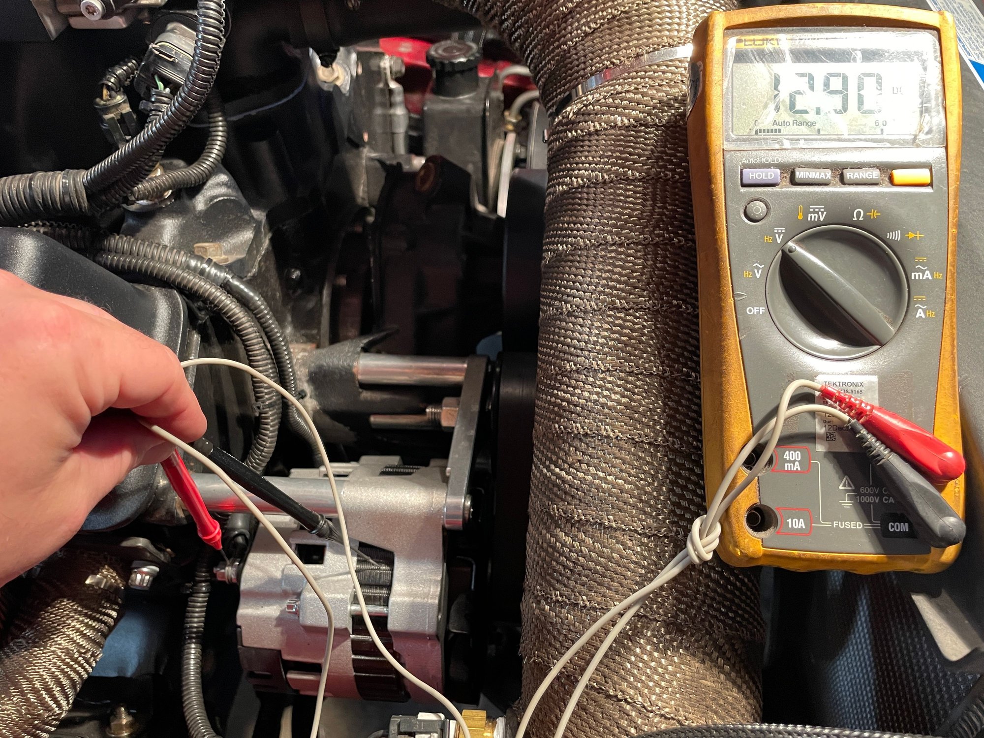 I spliced in a bulb socket using a new alternator plug, with key on bulb lights up and when the engine starts the bulb goes out, red multimeter lead on the battery post and the negative lead on the alternator case.