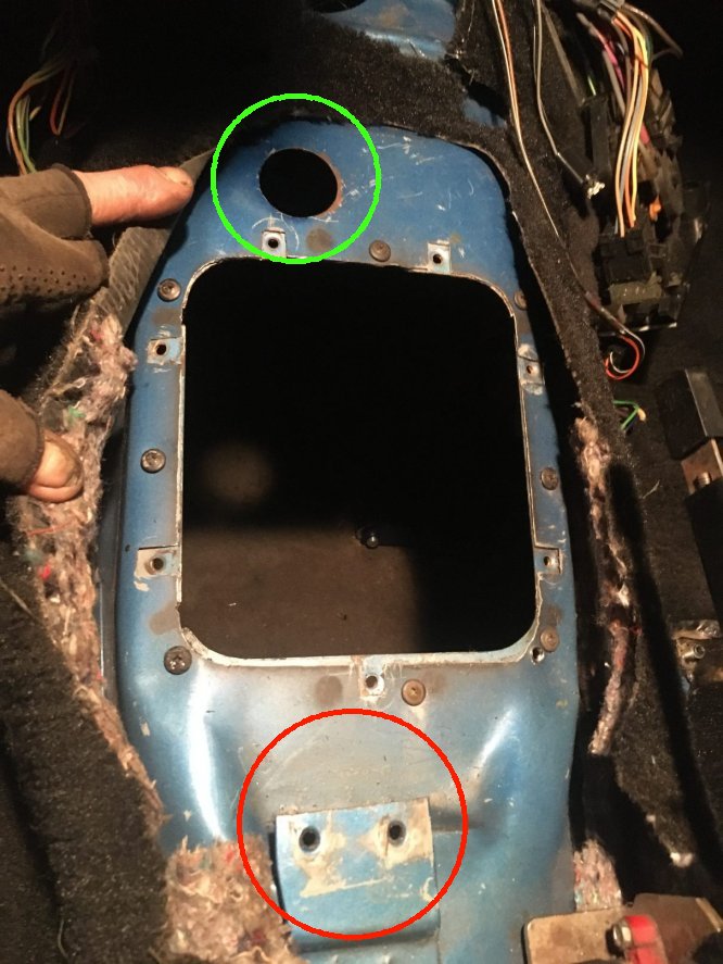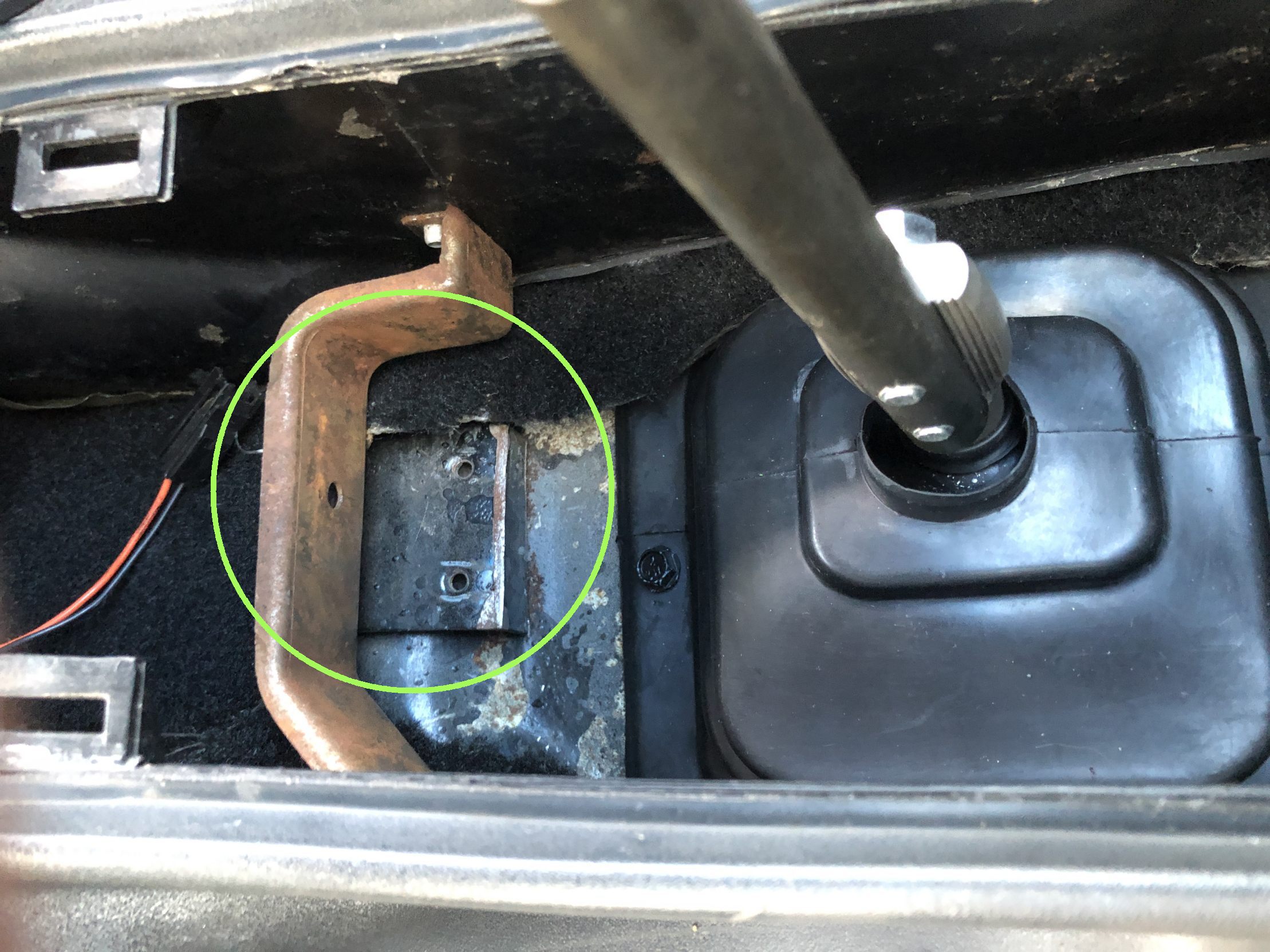 P.S. When cutting the hole in your floor for the Manual shifter you'll have to cut off some of the auto shifter mounting bracket. Don't cut the ENTIRE mounting bracket off,.. you'll want to leave the rear of the bracket in place so that you still have a mounting point for the center console. The manual cars used a small 90 degree bend bracket at these holes to secure the center console. ( no pic of the little bracket, but you get the idea ! ) Also; if you don't already have a plug,.. you can slice the rubber 'plug' from the auto shifter cable and use that as a plug for the auto shifters cable hole. Just stuff some type of 'filler' in the small hole in the rubber where the cable would have been.