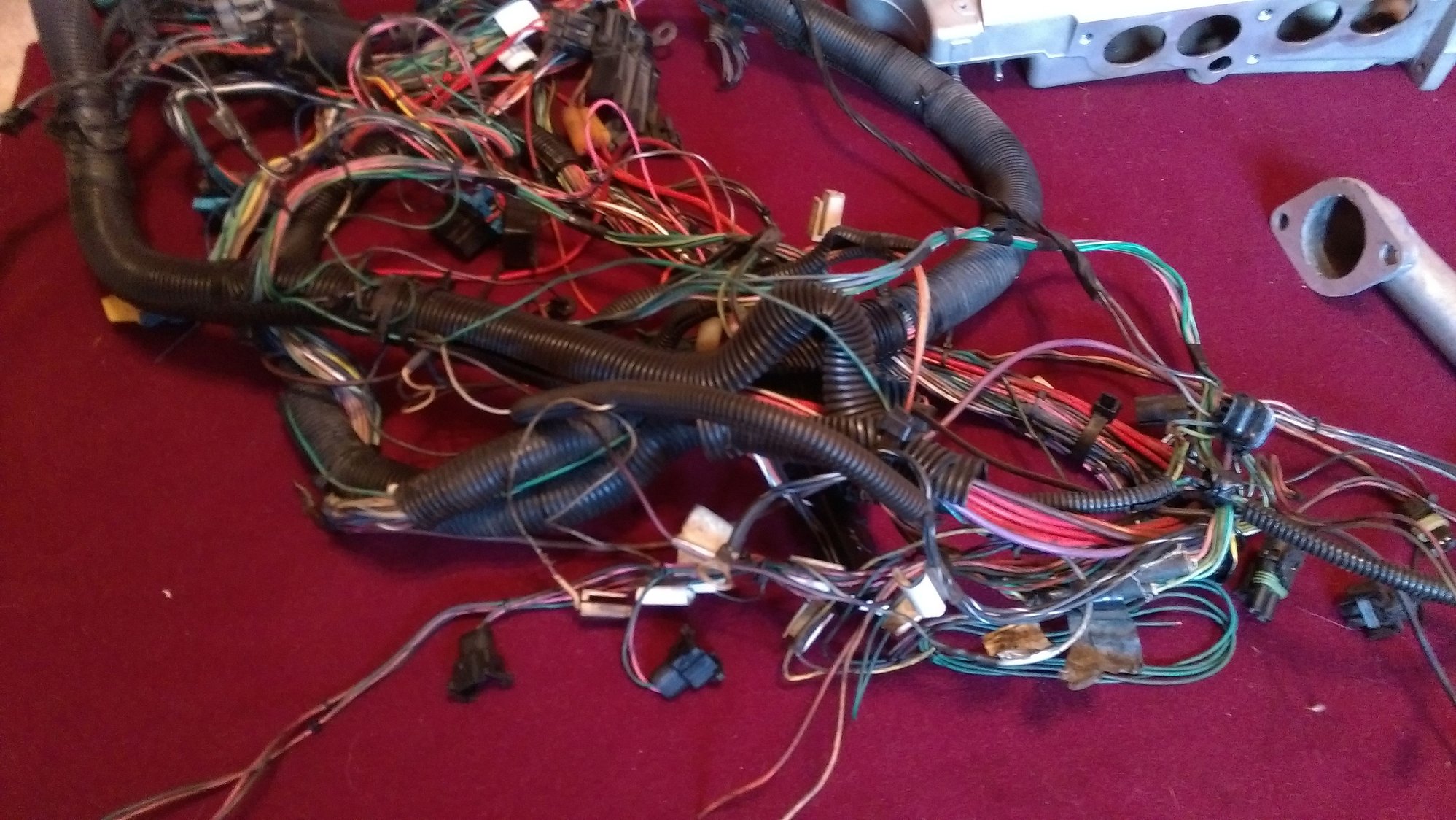 I think the 2nd cooling fan "switch" connector is cut off, and some blue paint on some of the loom. I think the charcoal canister wires were cut, extended and then shortened back up to stock. Other than that, its good, came from a running driving, very well, car.