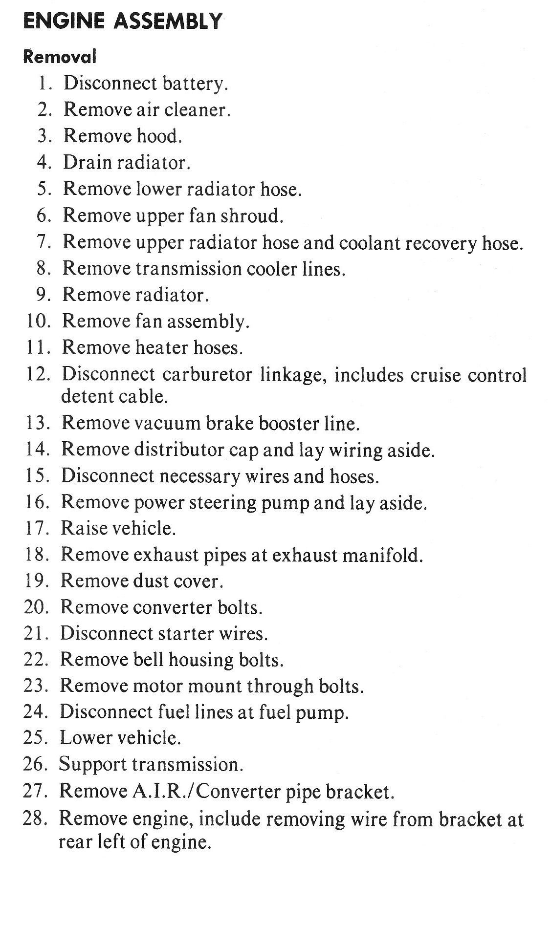 I'm not swapping to a different engine, just replacing with another stock motor. Mine's a 3.1 V6 with an auto but It should be generally the same as a V8 just with slightly more clearance. I have to do most of the work by myself and don't have any experience replacing these engines so I need to know everything, not just a general idea of what to remove. (I have swapped engines before but on very different cars)