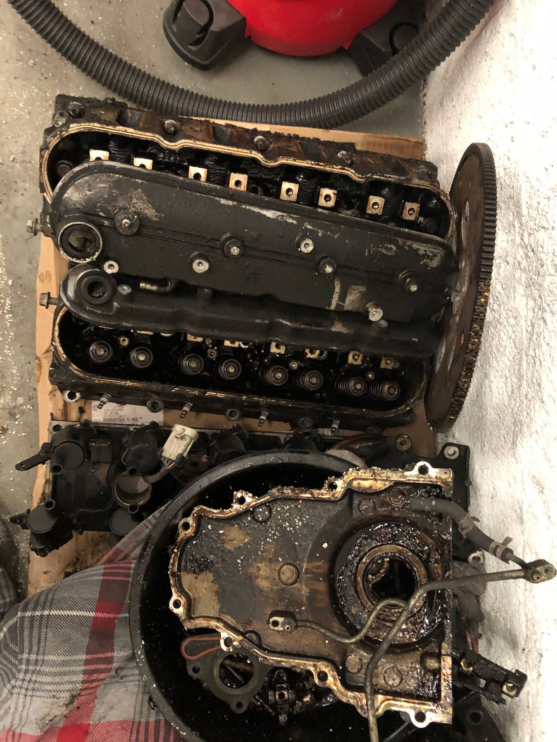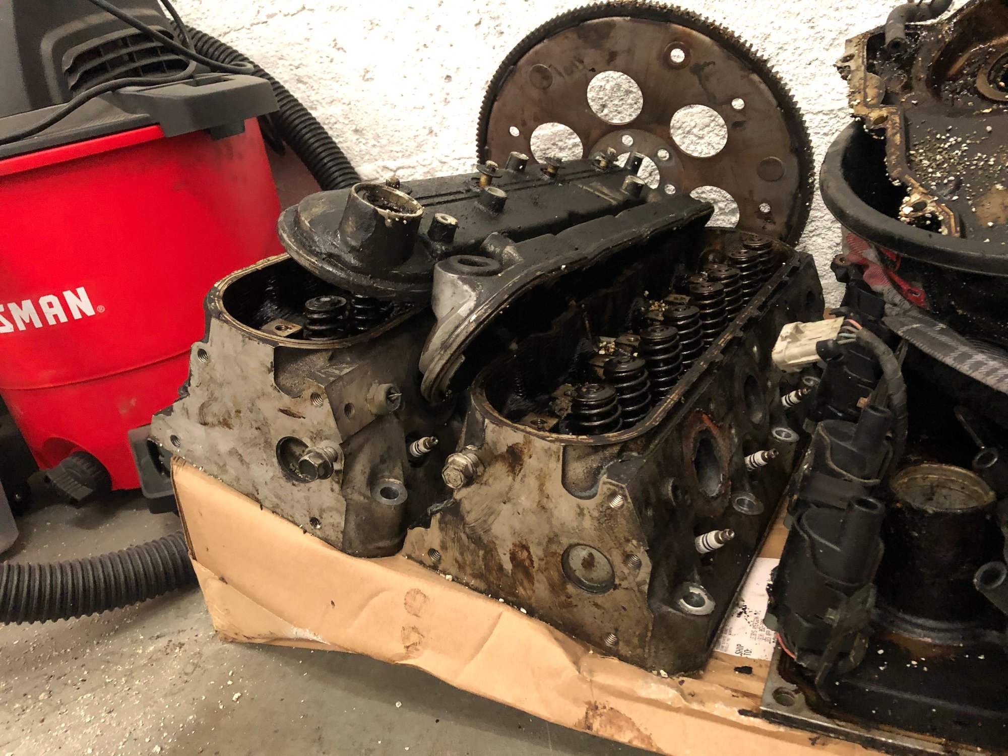 Got it on a tire for the night till I bring the stand and I could help but to start tearing into it. Looks like the head gaskets we’re blown. Will post more pics when it’s fully apart and on the stand. But it’s 100% able to be saved and rebuilt. I’d say it was worth the money spent. $300 long block, pulled and delivered right to my garage door.