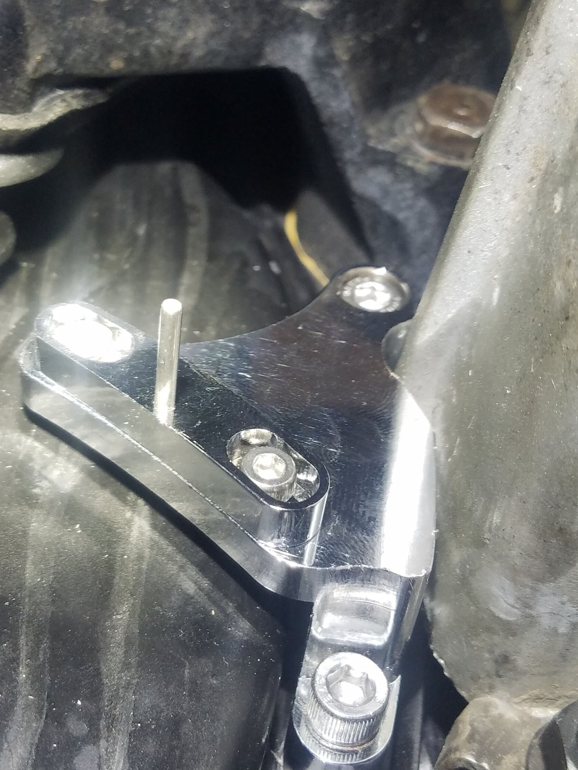 I spent an hour digging through TGO for any ideas on ways to get the compressor mounted. It is much better than the R4 style and worked great, no way was I going back to the old one. There was a post from several years back with someone showing how he made his brackets to mount the Sanden to the original housing. Looking at that, I finally realized that if I flipped the Dirty Dingo mounting brackets, it would rotate the compressor enough to hopefully get it out of the way. Success! I lost the lower mounting bolt, but the compressor feels very solid in its revised mount. Dirty Dingo brackets flipped from original mounting style. Rotated the compressor enough to clear the valve cover.