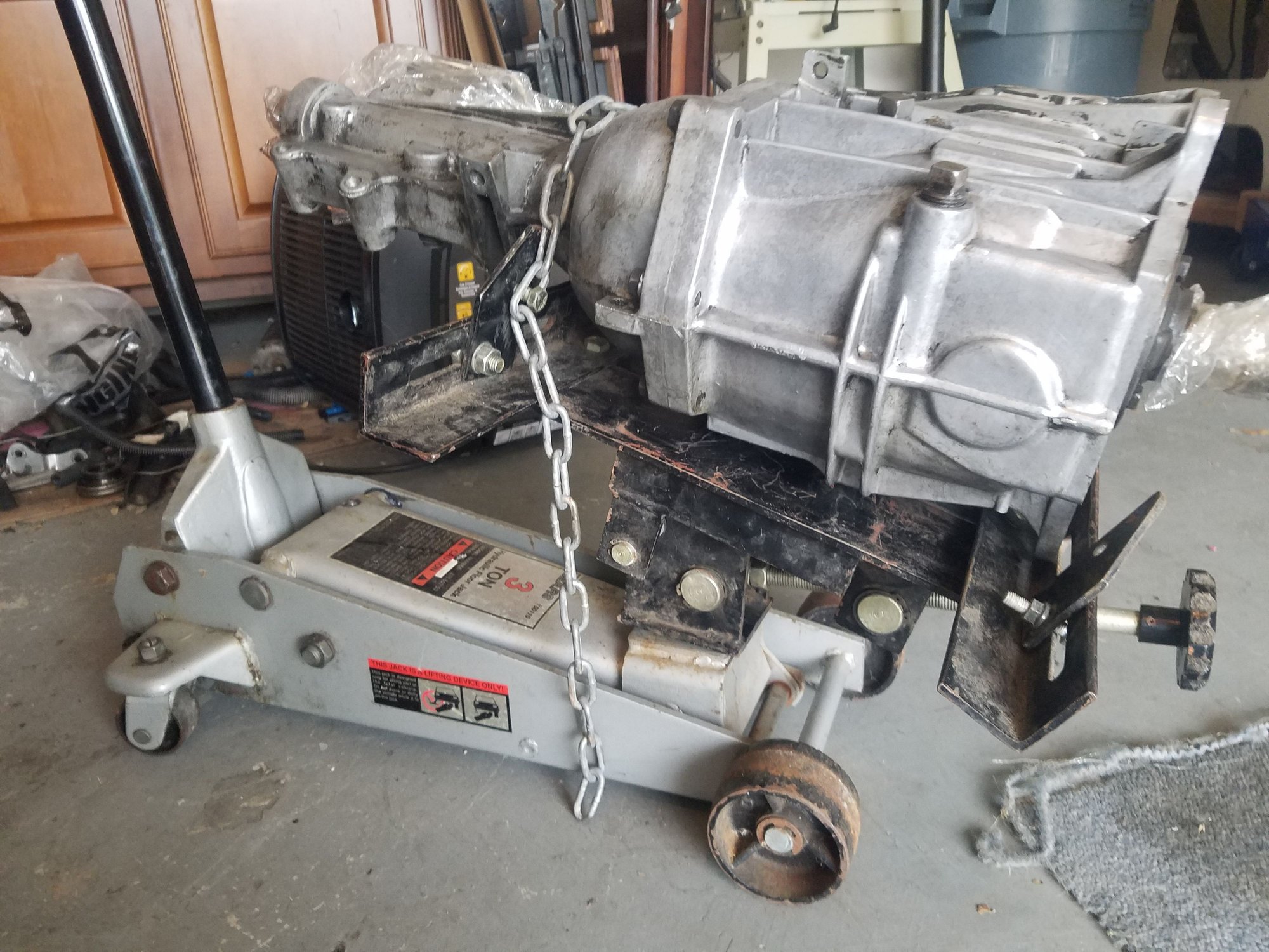 Here are a few pics of the transmission setup I'd hoped to use. I'd picked up a transmission jack adapter plate that fit perfectly into an older Craftsman floor jack that I'd just received from my uncle. Unfortunately, even with the car jacked up high in the air with the QuickJacks, then braced front and rear on the passenger side with jack stands, I just couldn't slide the transmission on the jack under the car. Tried tilting it forward so I could then pivot under the car, but no luck.\ My well-intentioned, but ultimately unsuccessful use of a trans jack adapter