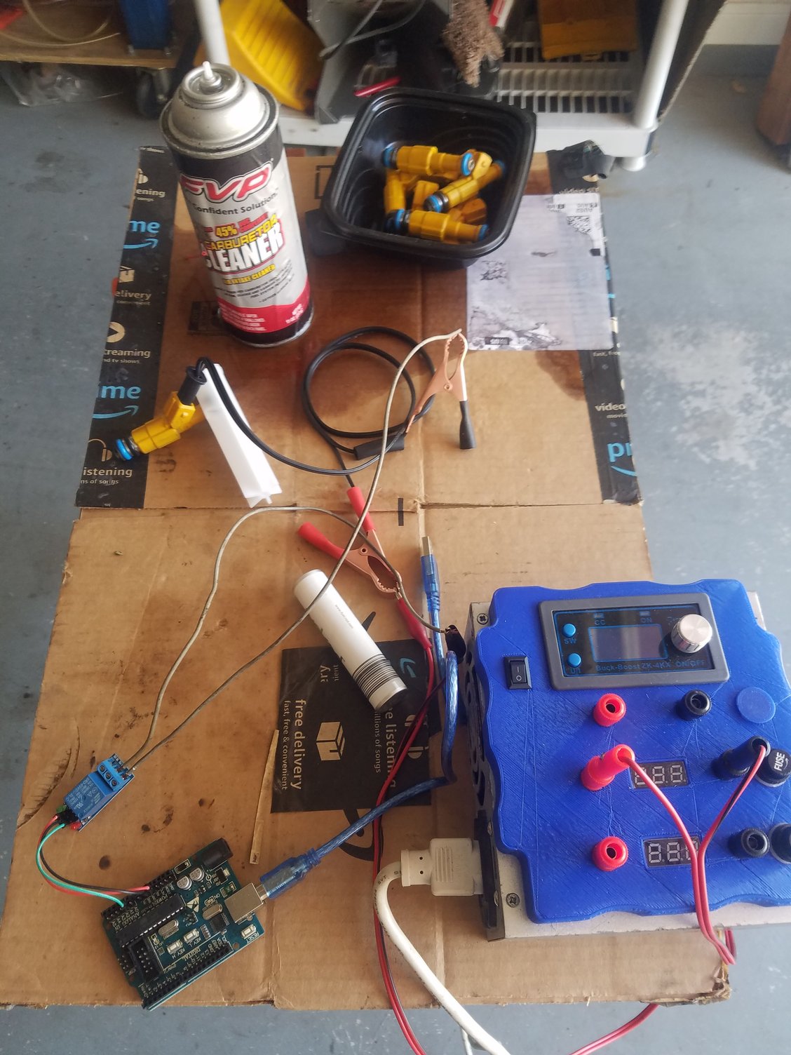 A modified computer power supply, an Arduino and relay to pulse the Bosch III injectors