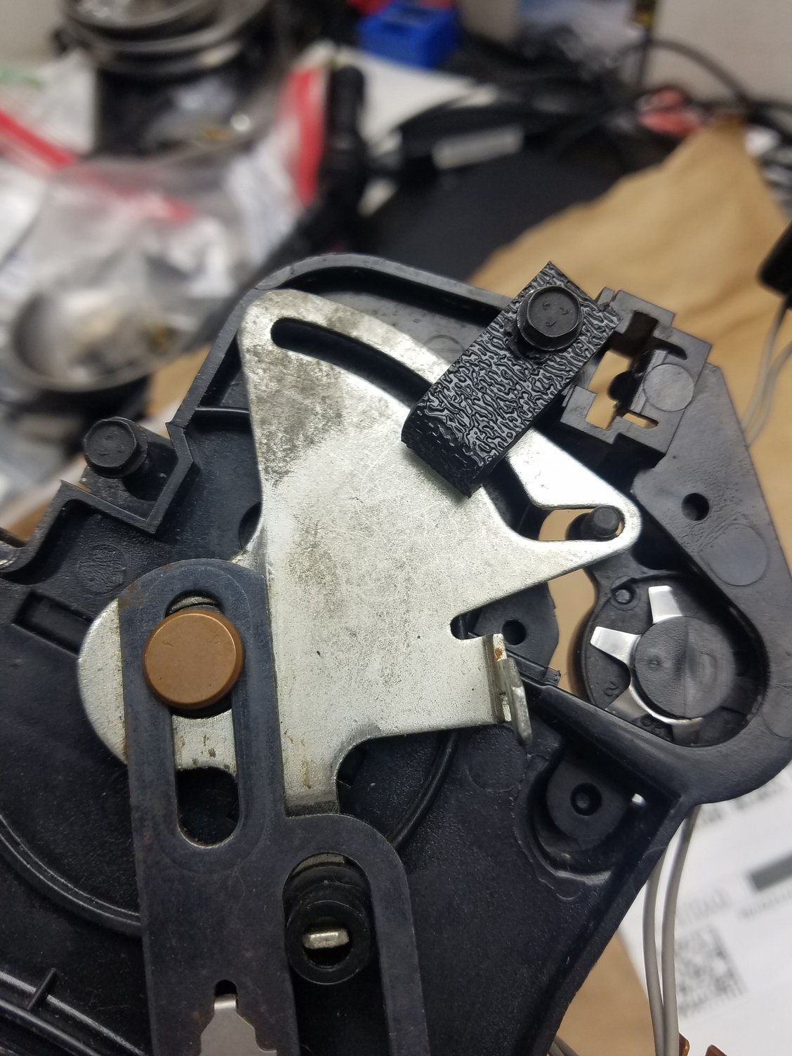After running all the vacuum lines, I wanted to troubleshoot the system. Could get everything to work once or twice, but then the vacuum would not turn on and off properly to the valve. After lots of checking, I found that there was enough slop in the stamped plate that the small pin that turns on and off the diverter switch would slip out, rendering it completely ineffective. Not sure if this was poor manufacturing from GM or just wear and tear on the unit. I chalk it up to a bit of both, as that plate should have been resting in a channel to keep it firmly in position. I scratched my head for awhile, then realized there was an easy solution. Above the plate was a hole that wasn't tapped, but located in a perfect spot to mount a hold-down bracket. I keep a couple small sheets of ABS plastic in different thicknesses, for random stuff like this. Cut off a small strip and gave it a 90-degree bend. Filed it down to where it provides a positive lock for the plate to keep it firmly in position so the diverter switch pin cannot fall out. Easy fix, took lots longer to come up with the solution than to make the part! Small piece of ABS to hold the vent control plate in place, thereby preventing the diverter pin from falling out of the slot.