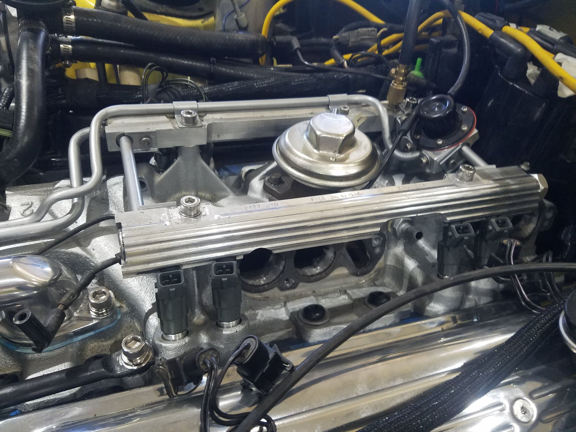 Valves were adjusted, engine still stumbling along, and my fuel pressure would drop fairly quickly when the car was shut off - even with both the main and return lines pinched. Decided enough was enough and ordered a rebuilt set of injectors from South Bay. That way, I was eliminating a variable of the unknown Bosch III injectors that came with my TPI setup. Aside from the fun of removing the TPI plenum and runners, was an easy swap. The spacer SFI mounts to the bottom of the injector makes installation of the fuel rail really easy. I had o-rings on the first set and they worked fine, but the rail took some wiggling to get mounted in place. With their space, easy-peasy.