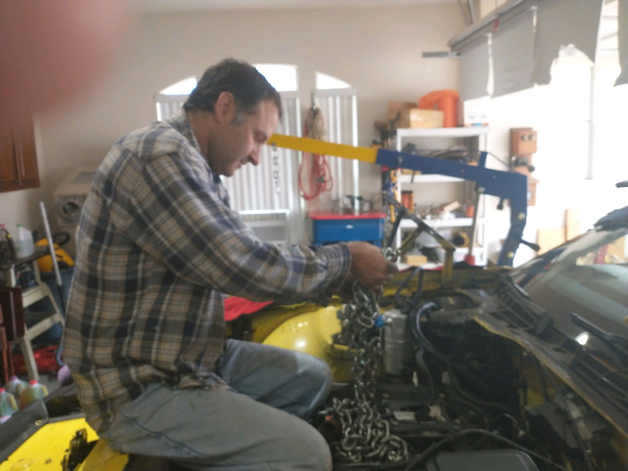 Engine pulling was a big day. My father came over to watch and lend a hand. Once far easier than I had anticipated (this is my first engine pull). Only the motor mount bolts were holding it to the frame, so after removing those and pulling the distributor to allow extra room in the back, the hoist gently pulled it free of the engine bay. Was a greasy, oily mess! Less comfortable than it looks.