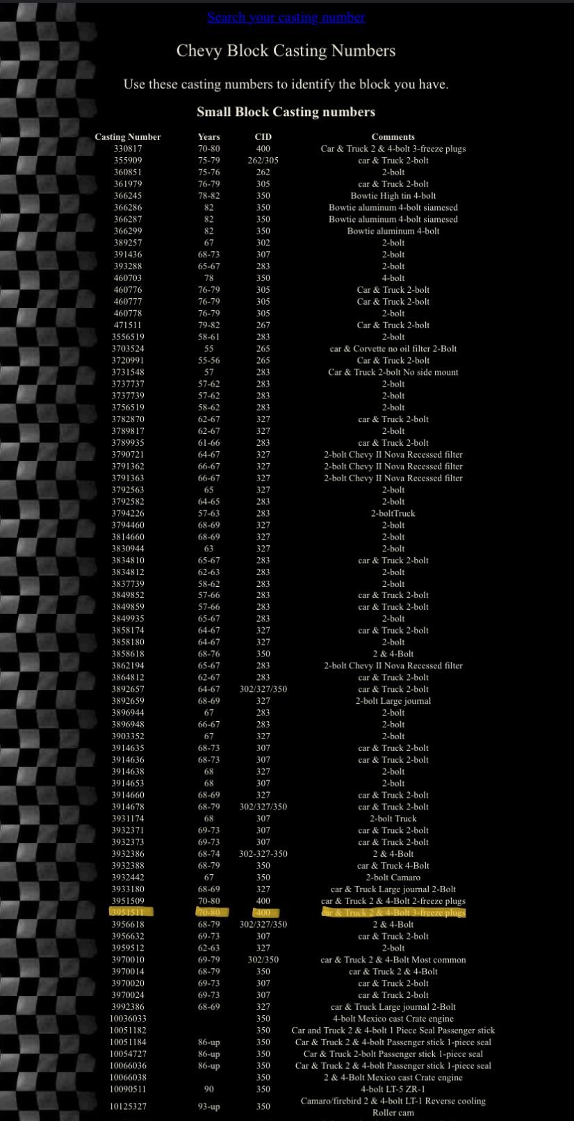The webbing was just ... lightweight ... in those. It's just the way those 3-freeze-plug blocks were. You gotta remember, in 1970, those things were put in vans, land yachts, stuff like that; and all had 2-bbl carbs. There were 2 "400" motors in those years; the "400 4-bbl", which was a 402 (.030" larger bore 396), and the "400 2-bbl" SBC 400. Think, grandpa motors, as they came from the factory. They had the worst heads, the worst gears, just the ultimate crap everything. Anybody that wanted anything even remotely "sporty" would go for the 4-bbl. They were set up for max torque; think, tight steering in parking lots with the AC on kind of duty. I don't think the factory ever thought that anybody would ever try to use them for anything more stressful than that. The later 2-freeze-plug 400s, like the one I posted photos of, are ALOT more like every other SBC of the time. My wife had a 74 Monte Carlo with a 400 back then, which was a pretty typical car application for them by that time. It was all but indistinguishable from a 350, viewed from the outside. Cool old car... triple black, every option I know of that they came with, except no tape player. She loved it, drove it well up into the 90s.