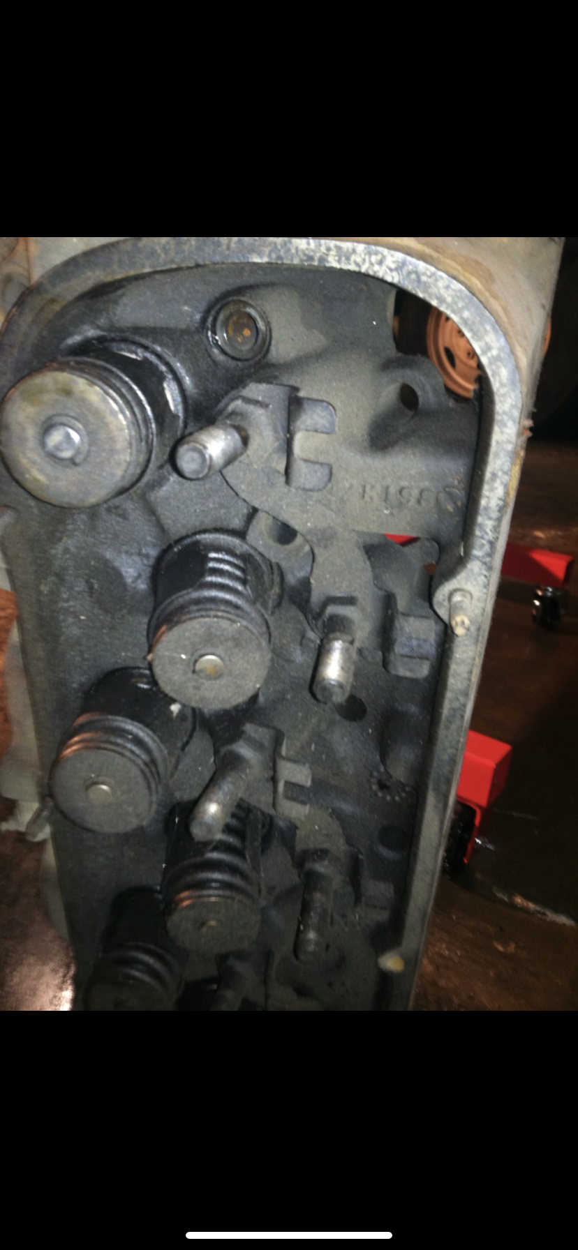 Head casting #s are down among the valves & rocker studs. Will have 6, 7 or 8 digits, something like 3927186 (referred to as 186 casting). If you see a number that looks like B120 (1 letter & 3 digits), that's the casting date; B120 would be the 12th day of the Bth month (the 2nd one, February) in a year ending in 0. On some stock heads there's a casting mark on the end of the heads; sometimes that's meaningful as well. These are the heads on that 509 block in the other pics. Note the "double-hump" mark; that's one to look for, on stock heads. If the heads are aftermarket you'd need the part # at the least, but even that won't necessarily tell you what valves are in them, etc. These are 186 casting with the double humps.
