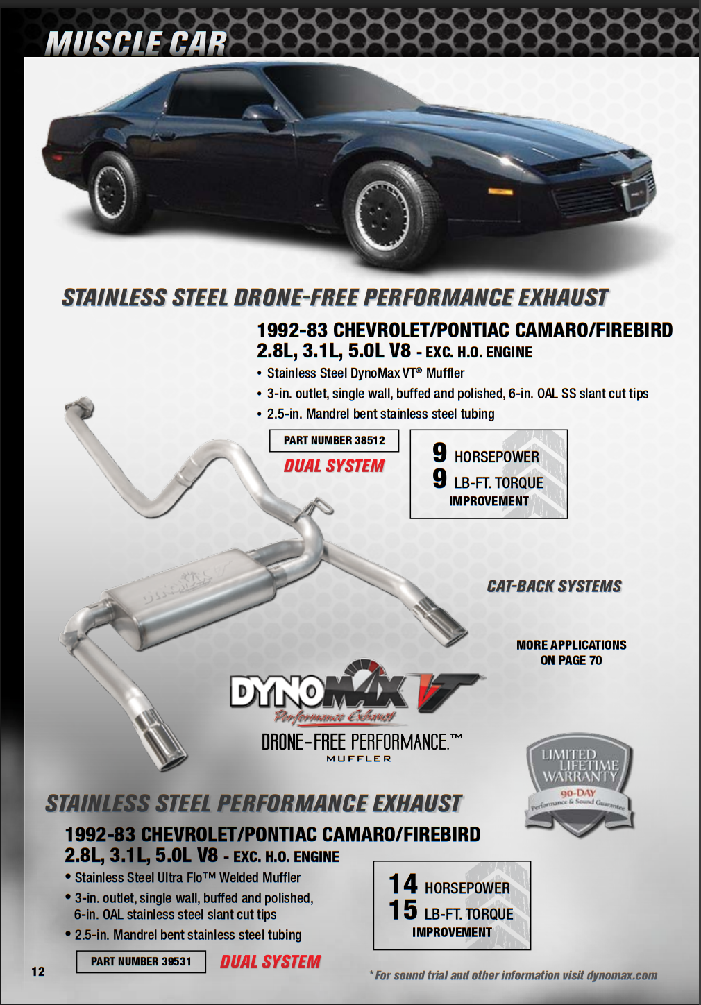 The exhaust system I speced out above is based off the DynoMax Ultra Flo Welded catback exhaust systems below for 2.8L & 3.1L V6 engines and low output 5.0L V8 engines. I would assume the LG4 carbed engine & the L03 TBI engine. I would assume the power gains claimed were for the 5.0L low output engines. The version at the top of the brochure uses a DynoMax Ultra Flo VT "Valve Technology" muffler and the one below it uses a DynoMax Ultra Flo Welded muffler. DynoMax doesn't make either of these catback exhaust systems anymore now, nor do they make the 409 SS Ultra Flo VT, 409 SS Ultra Flo Welded, or the 304 SS Ultra Flo Polished mufflers for our cars anymore. I substituted the Cherry Bomb Salute 409 SS welded "straight through" design muffler they make for our cars. It uses the same design and construction as the DynoMax Ultra Flo Welded muffler.