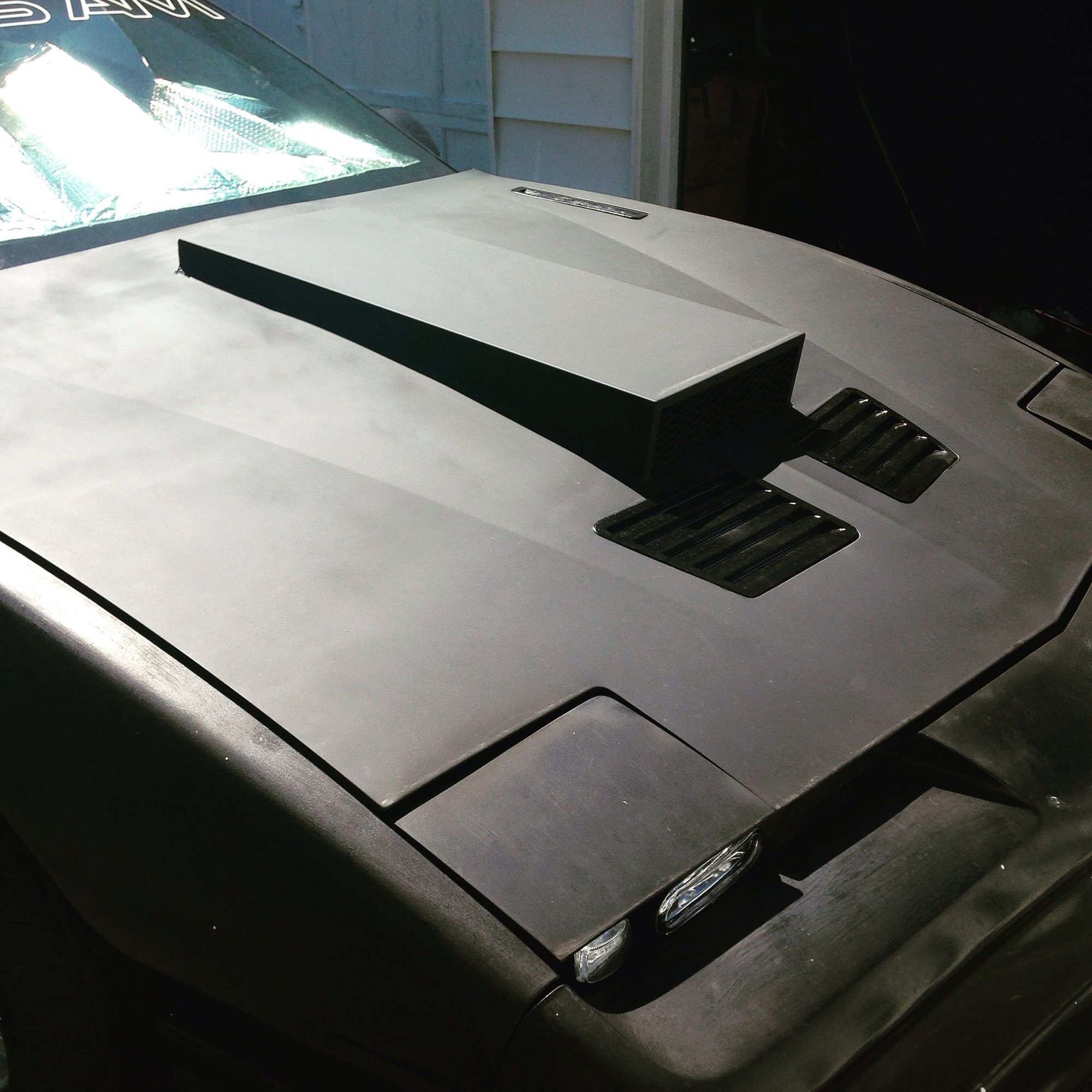 Maybe you can make some side peices from fiberglass or steel that bolt down from the scoop to the hood to make it just "appear" differently, and give it a more sinister look. Kinda looks like a mohawk. Some bent peices that mimic the hood line and could give it a more aggressive stance.