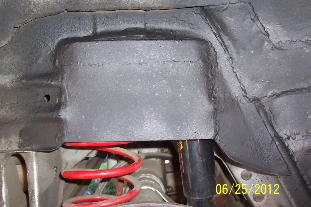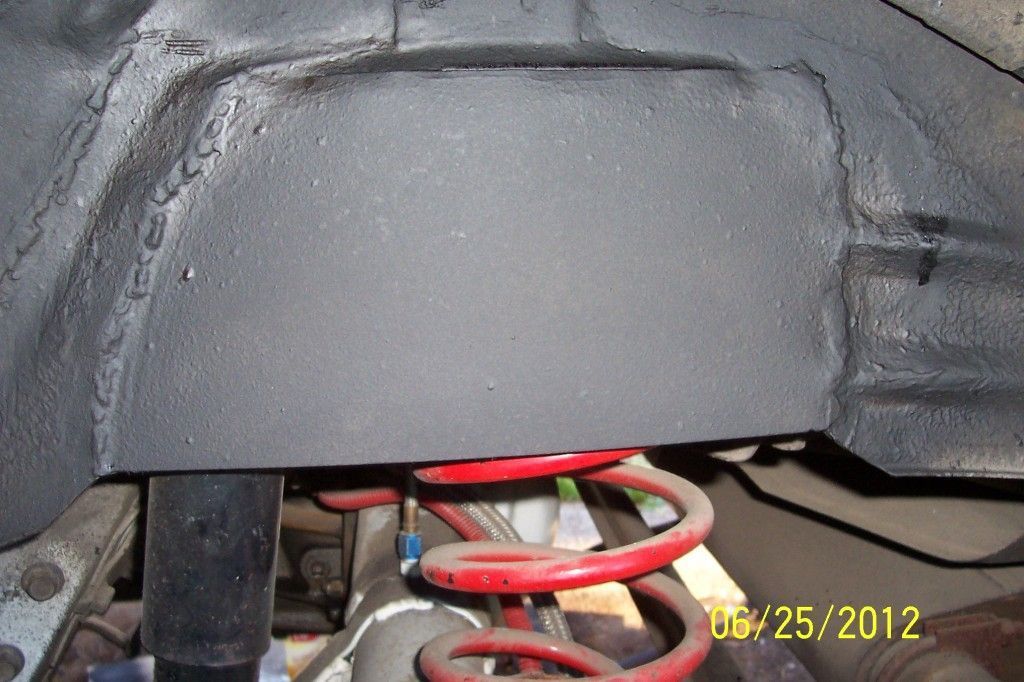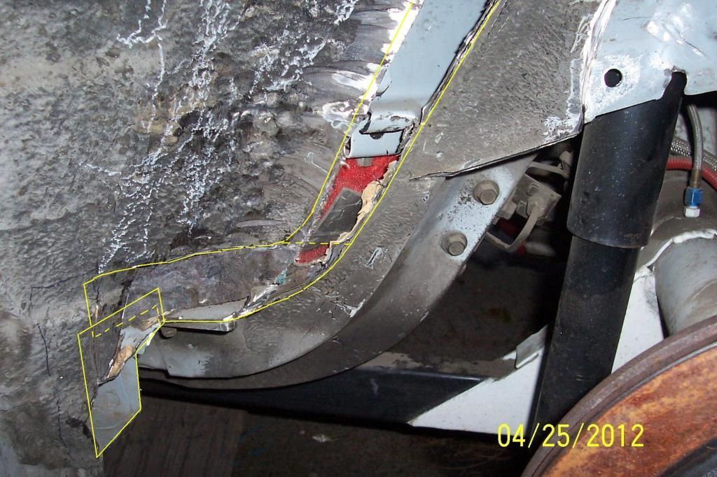 below passenger side. top strap is 1/16 thick steel added to top of sheet steel. bowed out. to clear coil overs going in after this mod. (there is plenty of room). is one wants to add the same 1/16th plate to replace what you cut out. then go ahead. in all you could just leave the plate in and just cut out the bump stop lips has this plate is not taking much if any room for tires.