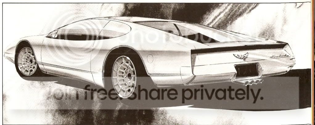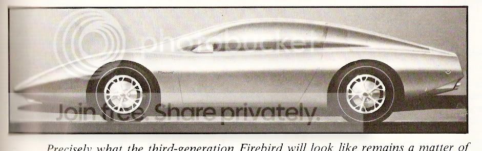 Ok folks, I've got my laptop working again, my power socket might be getting worn out. I'll scan in the rest of those photos sometime tomorrow assuming I get the chance. Will keep an eye out for more. I have actual photographs of the 1988 Banshee show car floating around on another thread I started somewhere on this board. Obviously that will be included in here too. I also have more photos of the yellow IROC concept and more floating around my house somewhere. I've got a couple more Firebird books to check, and I've got a Camaro book or two to check as well.
