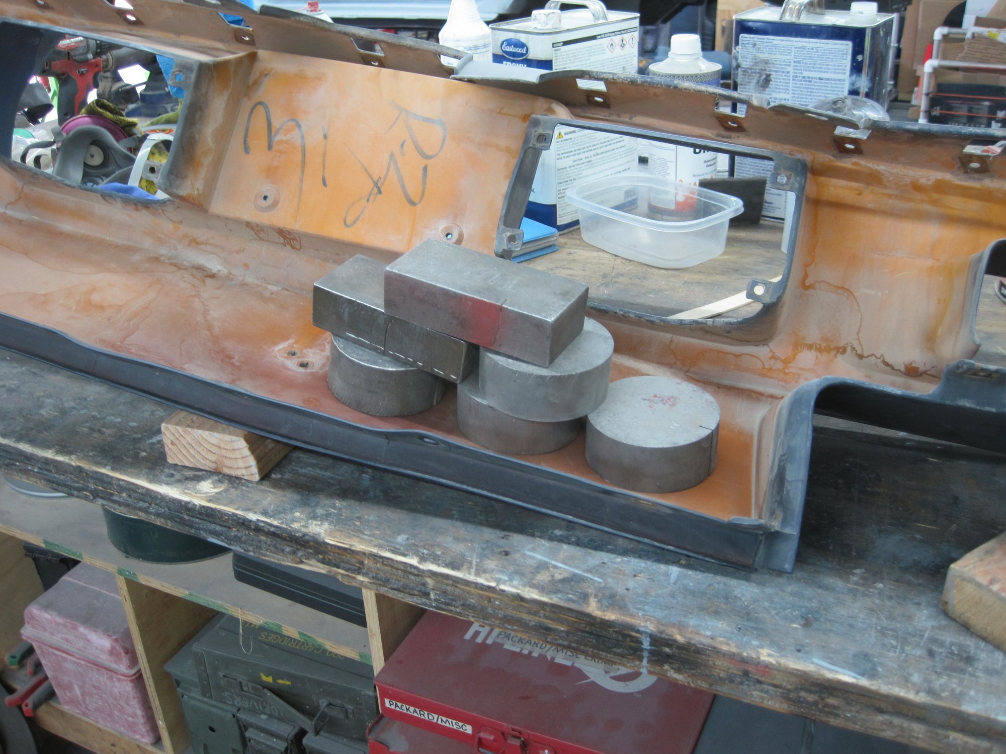 The last few days have been spent getting a few things in order to convert one bay into a paint booth and practicing my metallic spray technique on my scrap hood. The Luma III gun is nice! The spray pattern compared to my old DeVilbiss Finish Line guns is waaay better. With about an 80% overlap, it went on very evenly. I thought I had it whipped. (I don’t know what everyone is talking about; getting stripes, runs, etc.)