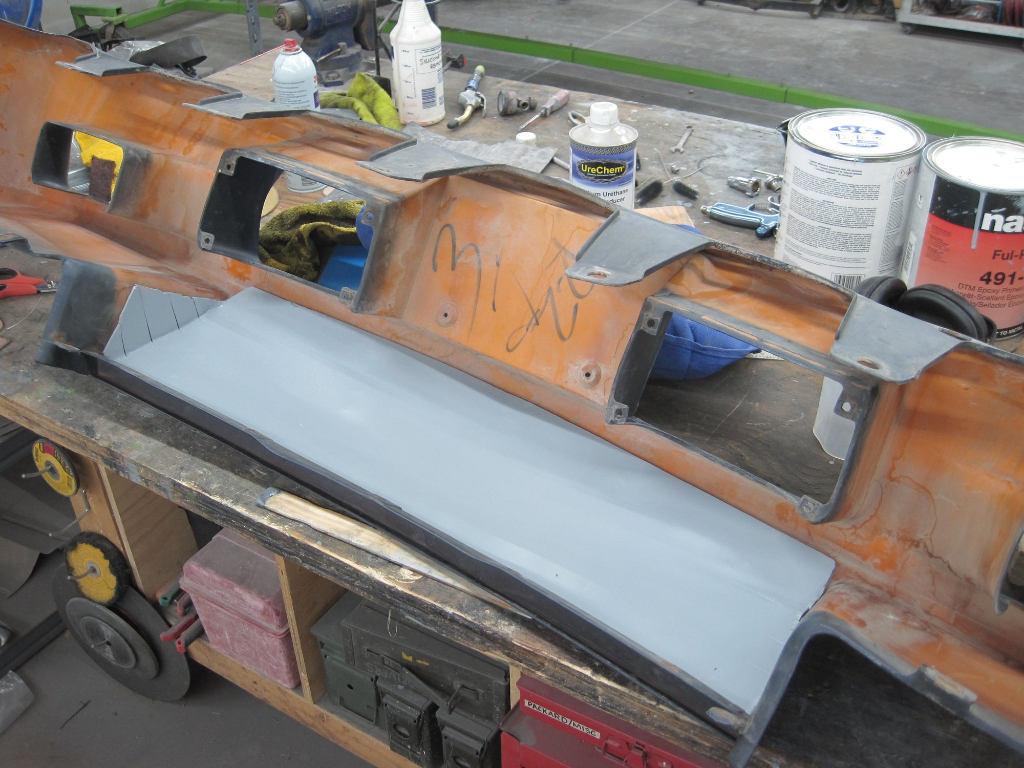 I shot the bare metal engine bay with black epoxy to prepare for the blue. Since I don’t have the booth up yet I need to paint outside but I need to wait until the front of the shop is in the shade. I didn’t get a chance today because I was working on the nose and it looks tomorrow is going to be too windy.