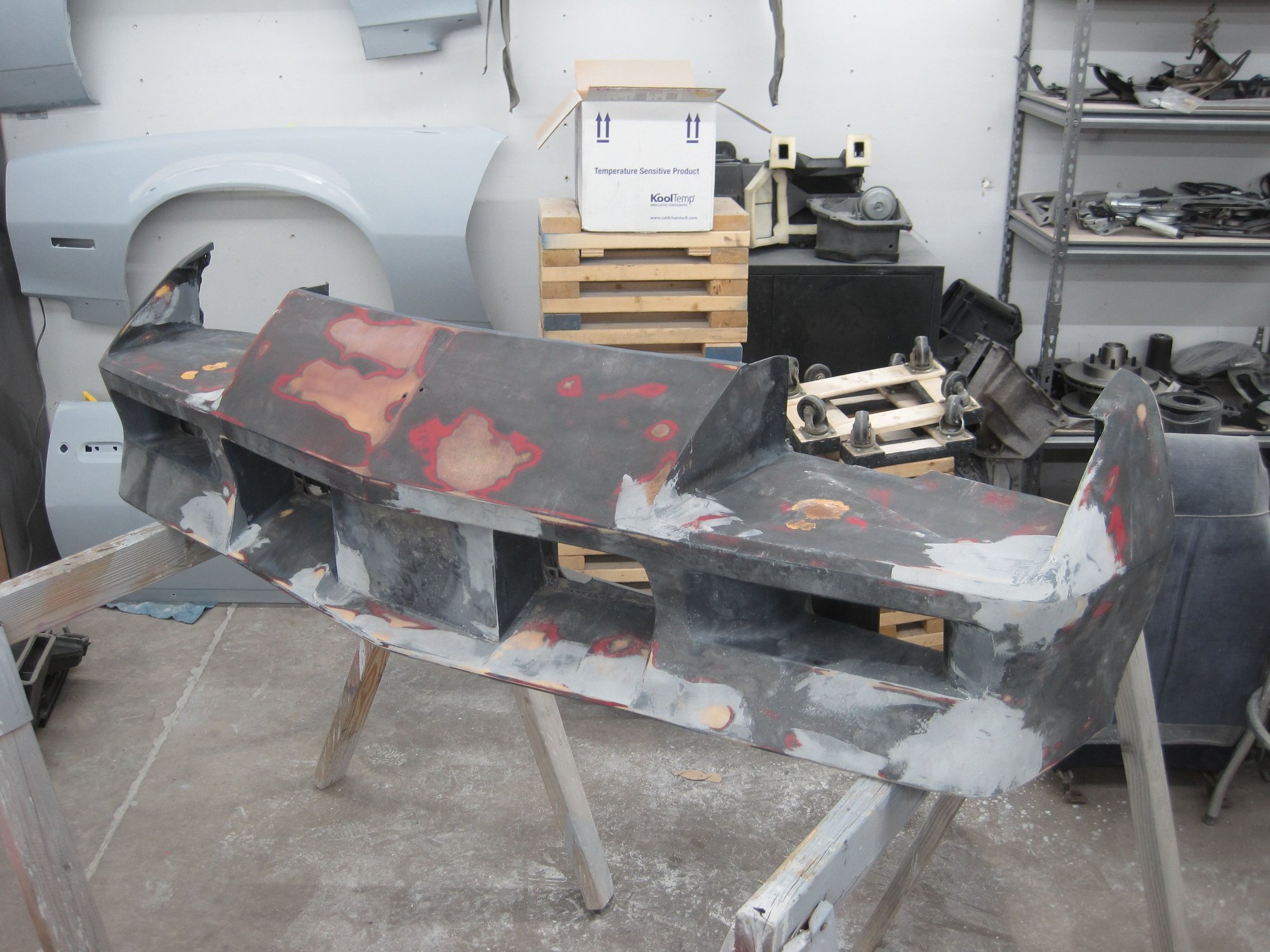 Back on the bumpers, I’m just about done filling in the cracked and deteriorated areas on the rear. I just finished stripping the front and removed material around the stress cracked areas. I guess I am getting lazy as I decided to only strip off the color down the primer. Compared to the rear, the front paint is in very good condition.