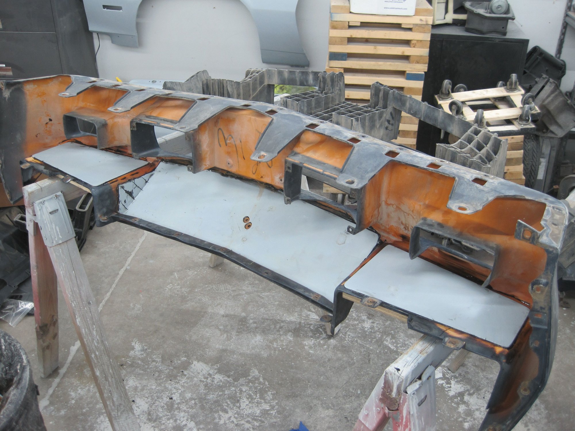 I am not looking forward to repairing the front bumper. The FlexFiller isn’t the easiest to sand and there are a lot of hard-to-get areas. It’s like sanding JB Weld. I need to address the typical sunken areas on the nose. I am looking at a way to place a couple of plates underneath to help support them along with using the heat process. There are also low spots in the headlight buckets. There are only two supports at either end underneath. I will try to fabricate a bridge between the two.