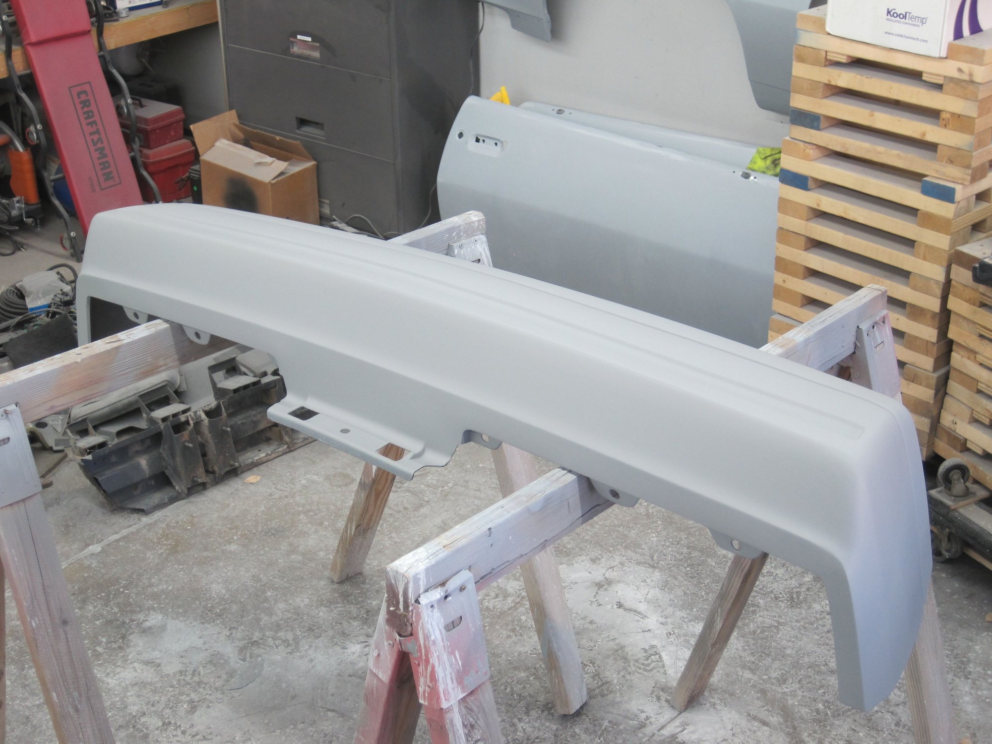 The rear bumper cover is done. I started sanding dry with 180 grit to remove the orange peel then went dry with 320 and finally wet with 600. I burned through a few areas, so I just shot a thin layer of primer over those spots and lightly wet sanded with 600. I think it will turn out OK. There are a few slight wavy areas I can feel but I think they will be hard to spot.