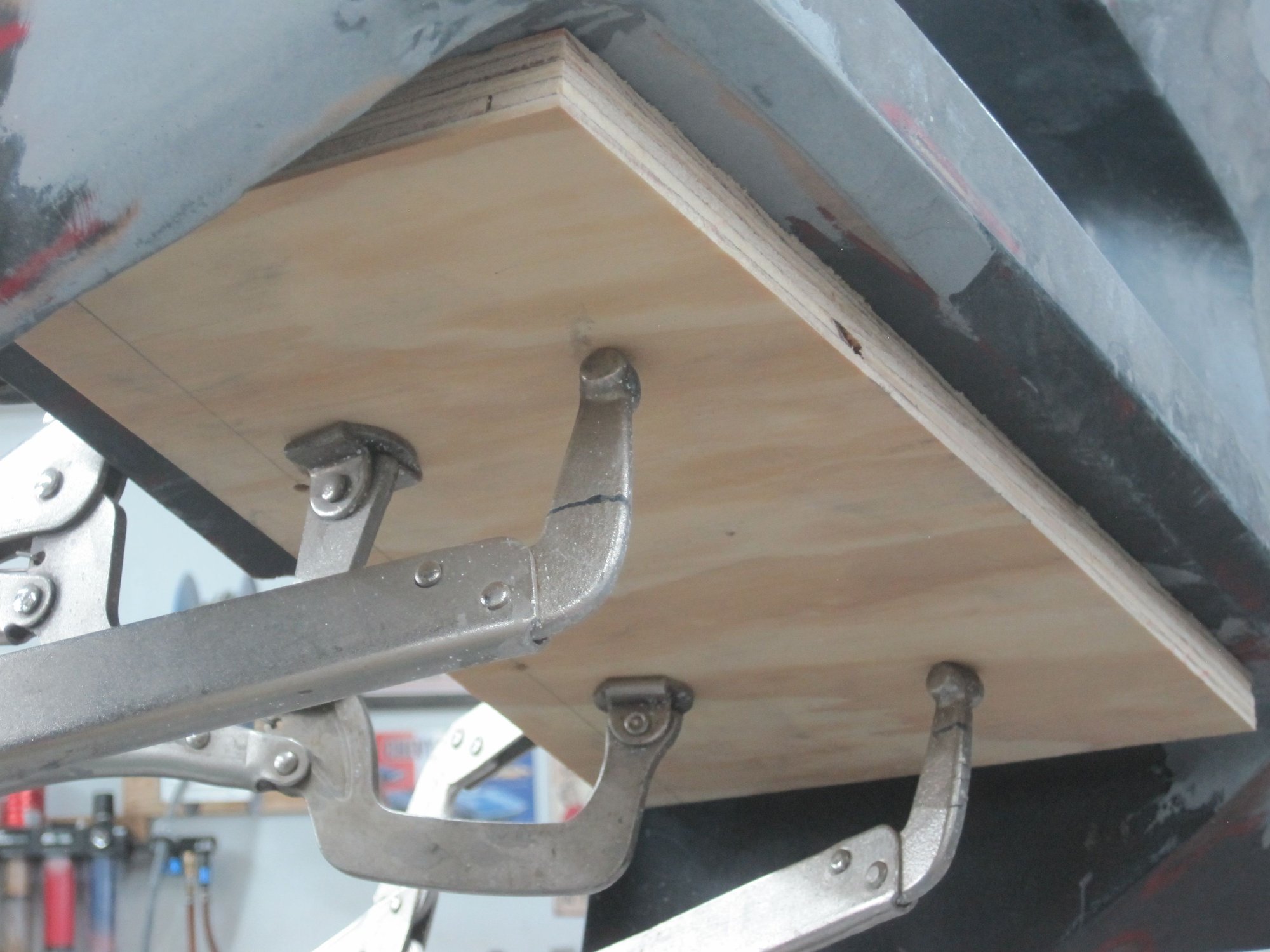 There were a couple high spots, however. I placed a 2x4 on the underside of each high spot with some shims on the end of it and a smaller piece of wood on top of the high spot and used a C-clamp to squeeze them together and push the high spots down. I was concerned the adhesive might delaminate from the plate and nose while doing this. I can’t tell if it did or not. We’ll see if the plate holds its shape.