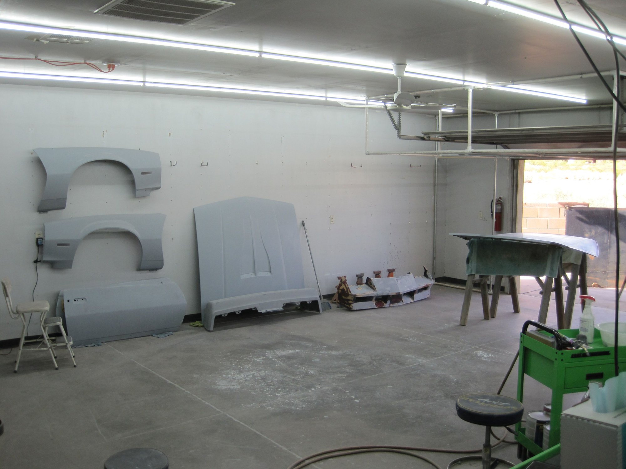 While I wait for the Flex Filler, I got started on clearing out one of the bays to get ready to put up the paint booth. The shop is a mess with all the sanding dust that’s accumulated. Now that it’s bare I can set up the exhaust fan in the door to suck out the dust. I use an air hose along with a leaf blower to blow out the nooks and crannies and then towards the fan.