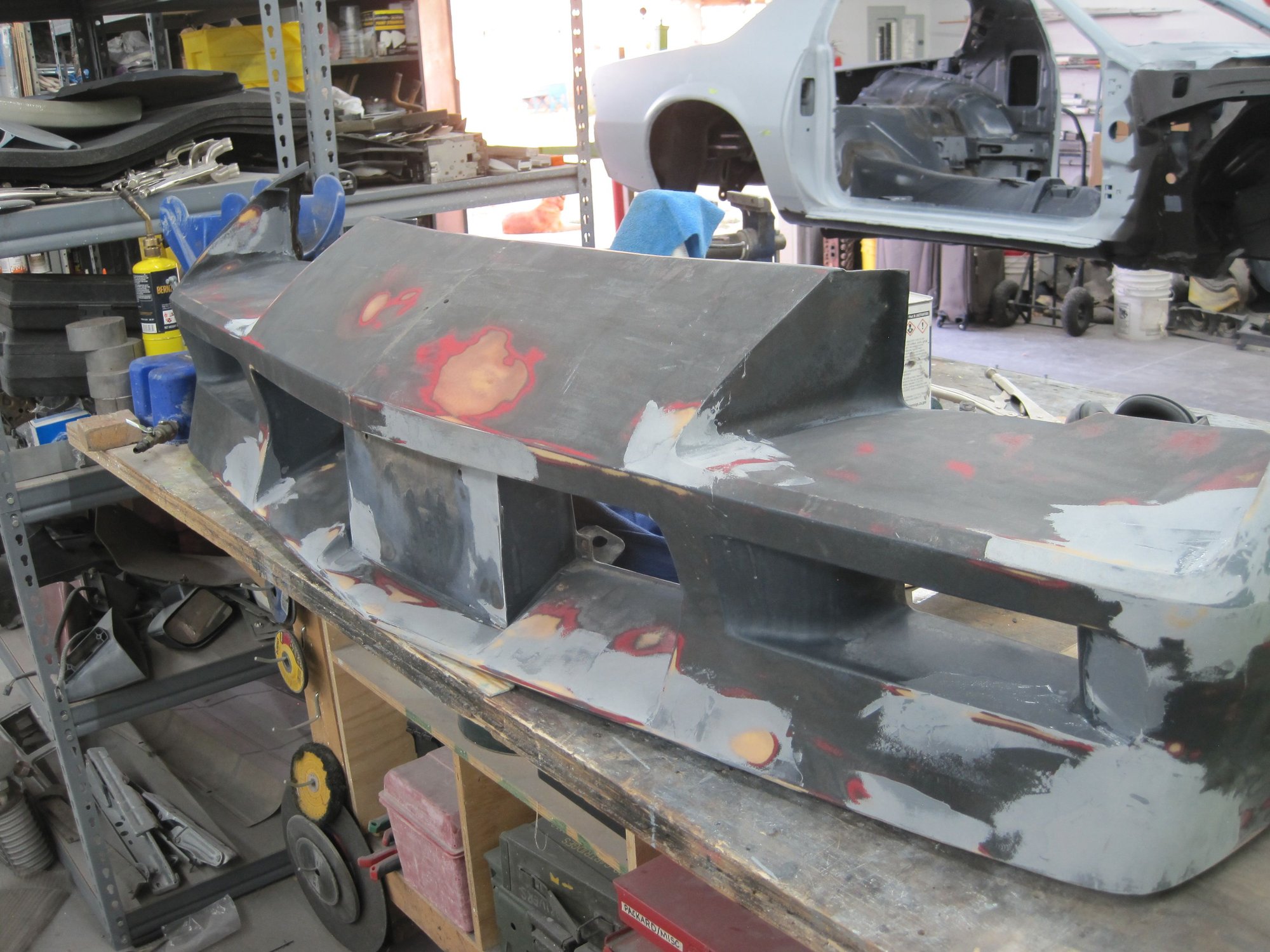 The rear bumper cover’s bodywork is done. Even though the Flex Filler is a bit slow to sand it feathers out nicely. I got the surfaces pretty flat, considering it's flexible. I shot three coats of the Polyvance E-Z Sand Primer Surfacer. I’ll let that dry overnight and start wet sanding tomorrow. I did some preliminary bodywork on the nose earlier. That’s going to take a while to get ready for primer.