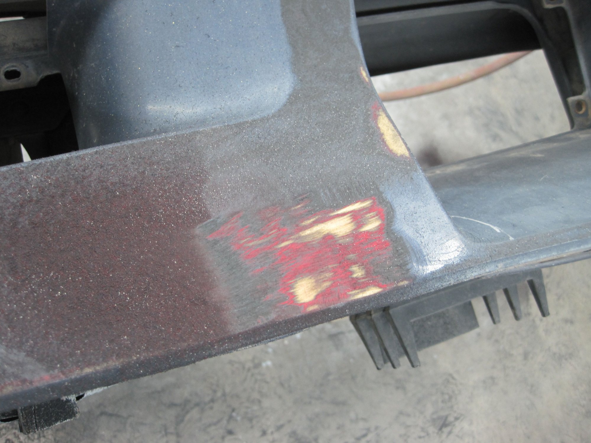 I noticed on a few places where I sanded through the primer, there was a red layer. It doesn’t look like any kind of primer I am familiar with. I wonder if it was previously painted red. I’m 100% sure that this is the original bumper.