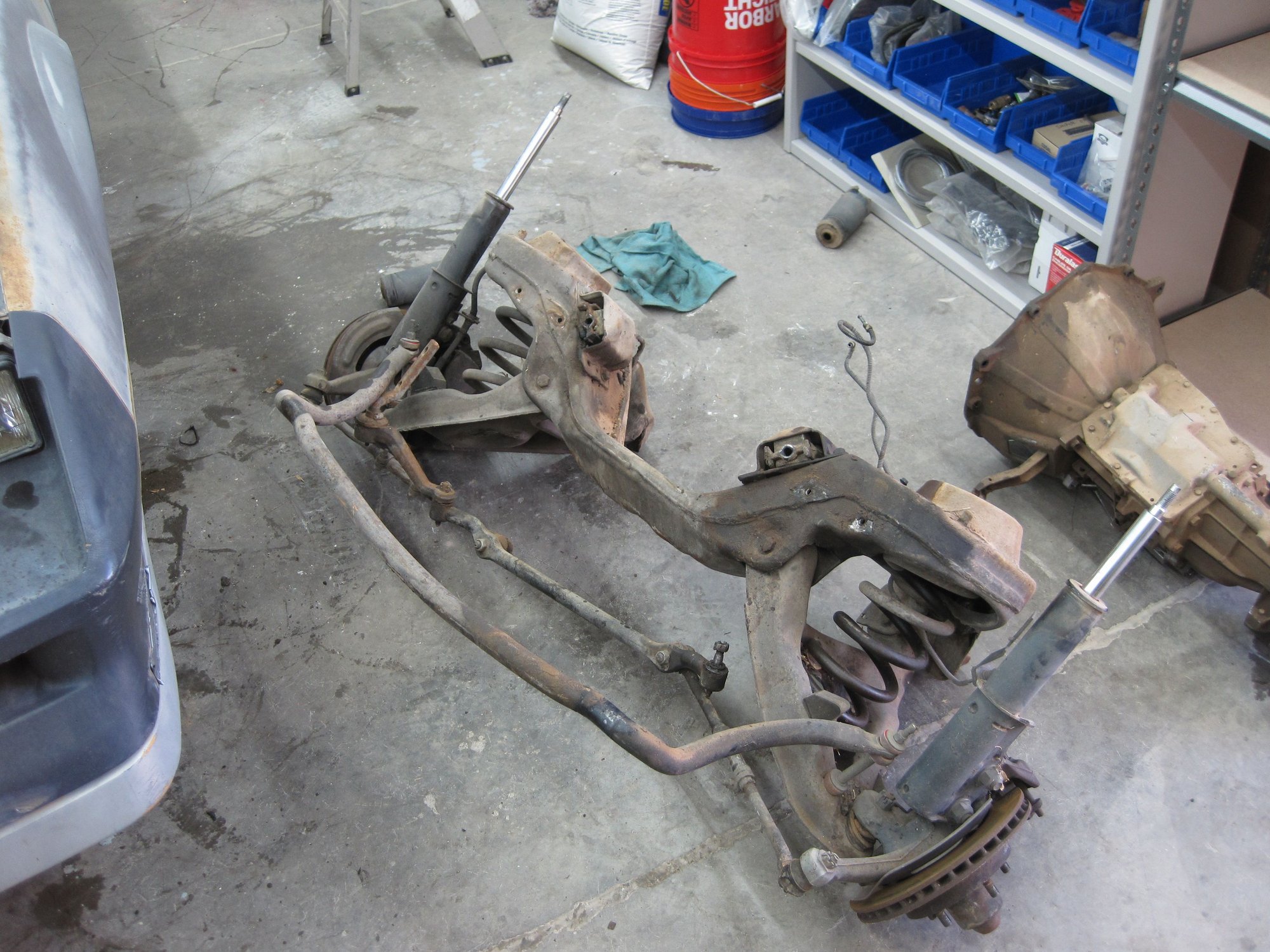 Today was an even shorter day but I was able to remove the front crossmember. It didn’t come out gracefully but it’s out. I discovered that leaving the sway bar connected to the lower control arms keeps the springs in place. I’ll just have to compress the springs so I can remove the link nuts without it exploding on me. I don’t think I'll have as much stuff hanging off it when it comes time for the install. But, for the first time, I will attempt to install the engine and transmission from the bottom. It still won’t be as glamorous as a First Gen subframe/engine/transmission install, but I think it will be easier to install most of the related parts outside the car.