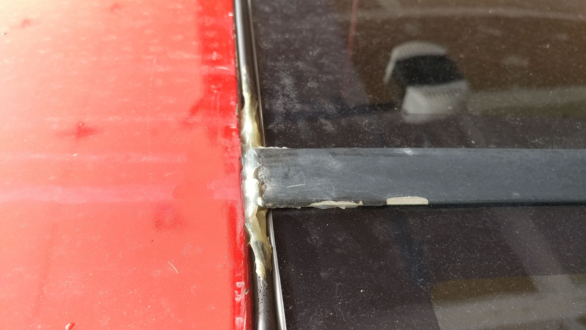 The water collects where some weather stripping seemed to be old near the rear of the middle bar (technical name). It then runs down the plastic piece directly behind inside which drips near the doors. I used some sealer, I believe silicon (whatever it was it is waterproof obviously), and filled it in, but the leak continues. It looks pretty bad now and needs to be redone properly now that I know that did not solve the issue (pic below)