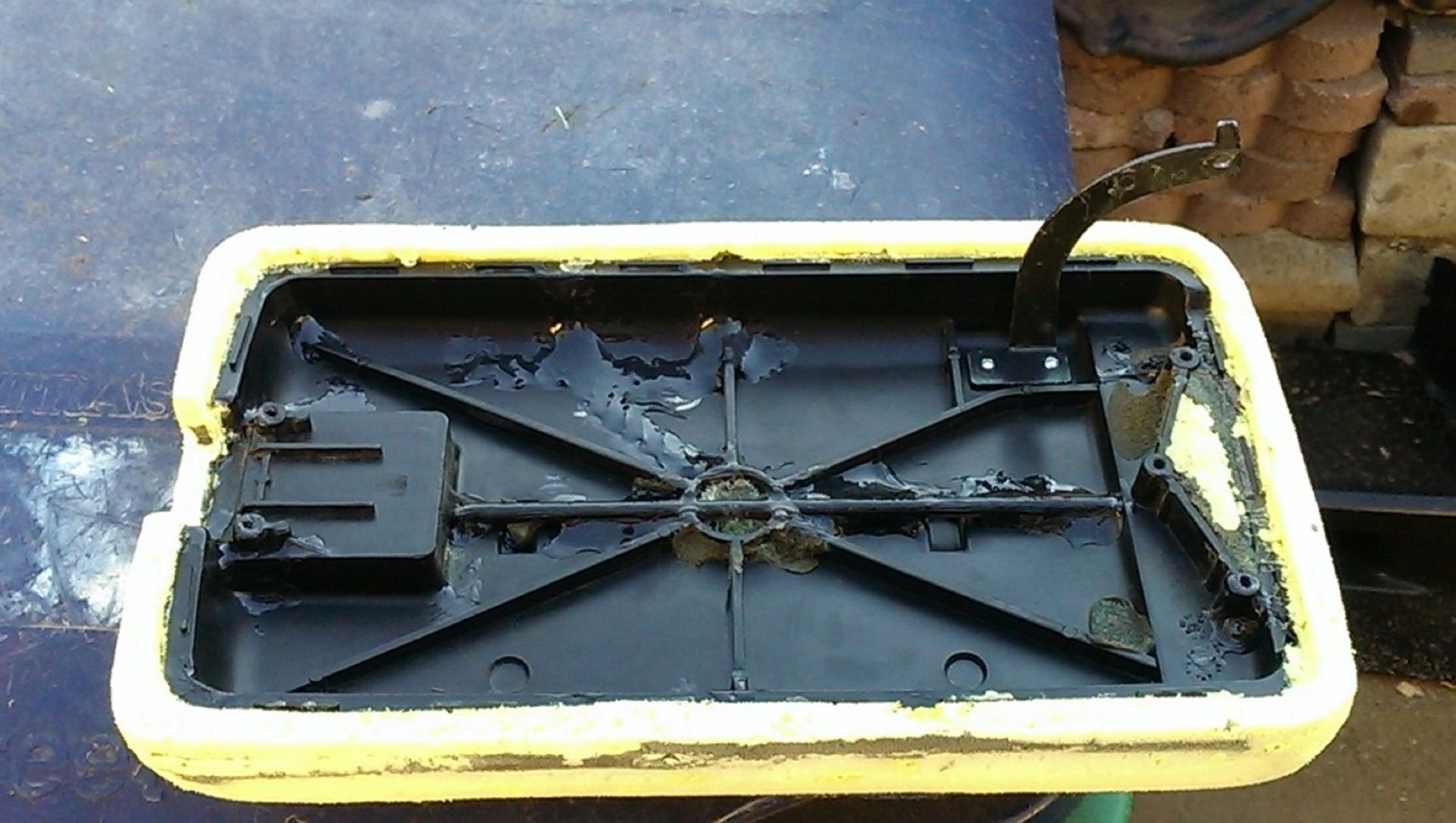 Anyhoo, now on to the console lid. The top is in decent shape, however the plastic underneath including the screw holes are cracked with huge chunks missing. It’s beyond anything epoxy or fiberglass can help.