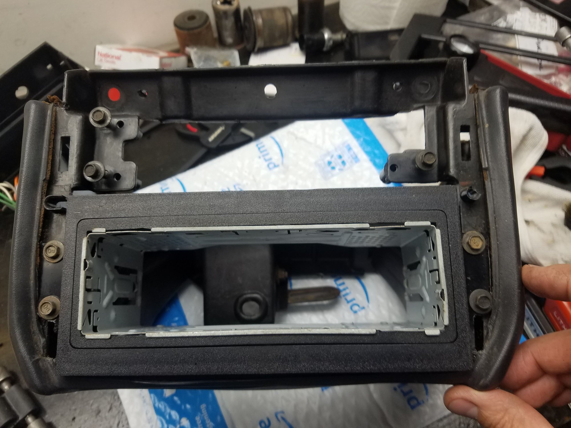 Both my project car and parts car came with single DIN aftermarket stereos and the adapter. While the project car adapter was missing some brackets, the parts car unit was complete. That helped locate the holes for the lower section that I had rebuilt. It also let me to realize I had to botch the area to accommodate the bolts that attach the bracket to the shell.