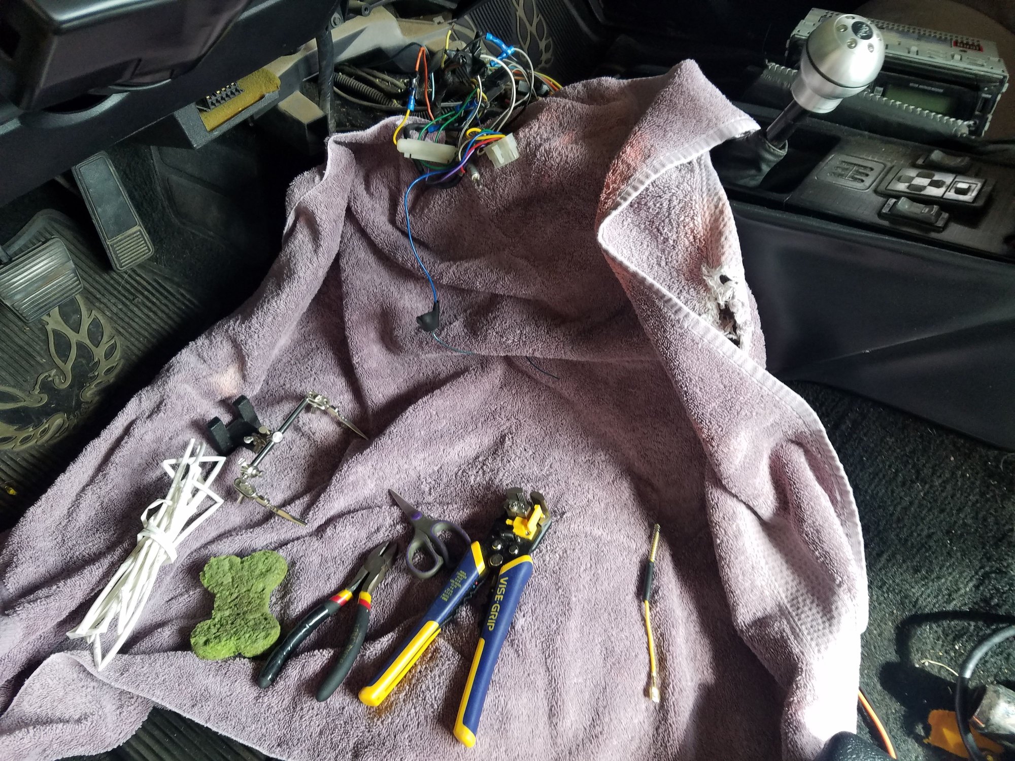 My work area to remove old connections, solder and heat shrink. Had seat out already for under dash work and steering wheel was only finger tight. Managed to break the rab on the brand new horn wire when I yanked the wheel off. Sigh. More soldering.