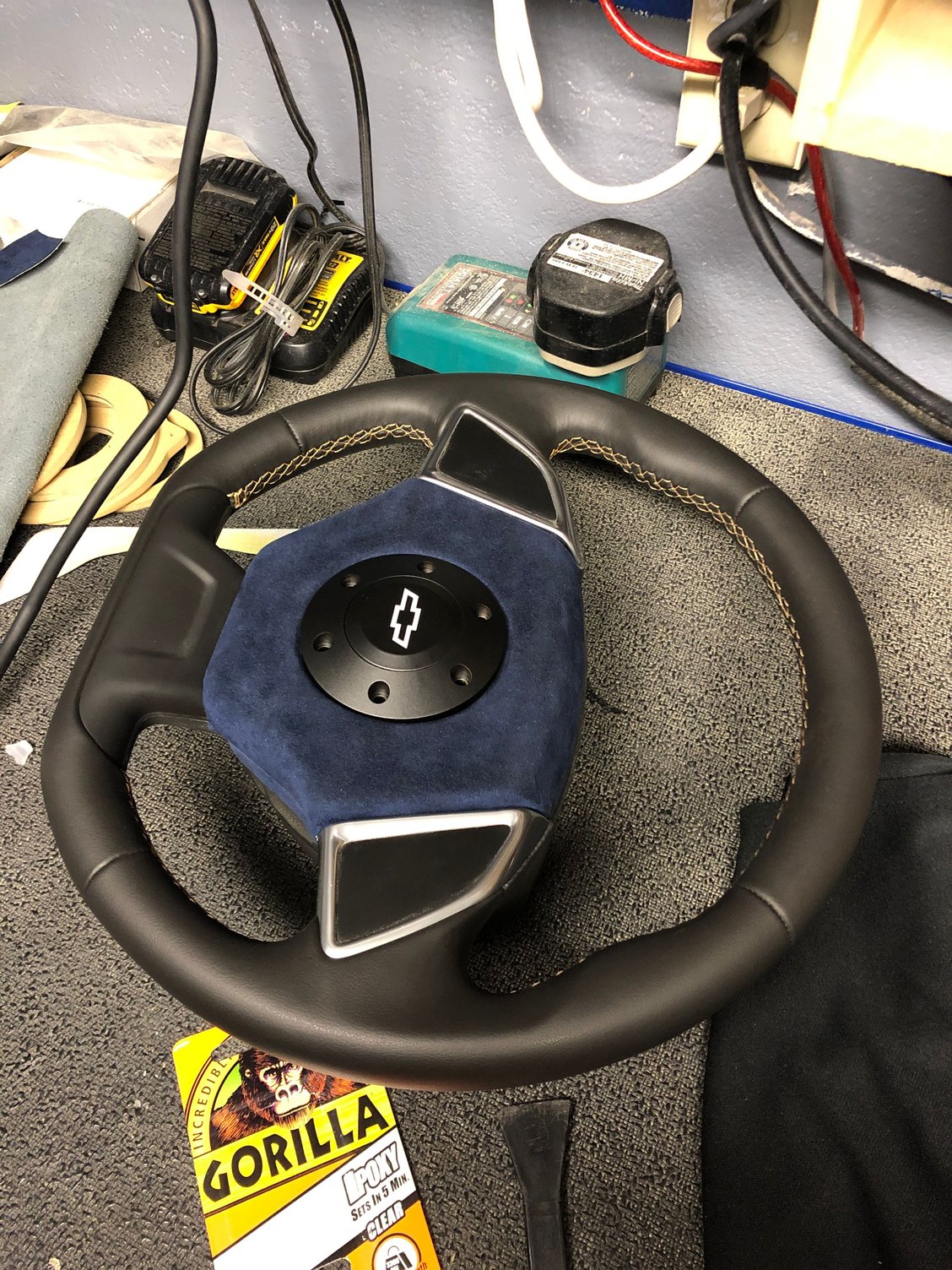 Every one told me it can’t be done well here it is! 2 pieces of plastic bonded and molded and formed Test fit before alcantara Completed Installed Start of forming plastic Center cut and beveled, mounted using large center nut and clip, as well as using the grant adapter. New extended wires for horn.