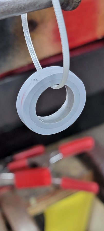 I glued the coupler on to the pipe then cut it to the size I wanted. About 1/4" thick. Then ran a 41/64 drill bit down the middle to auger it out to an internal diameter of 5/8 (16mm). Painted it with SEM Landau black.