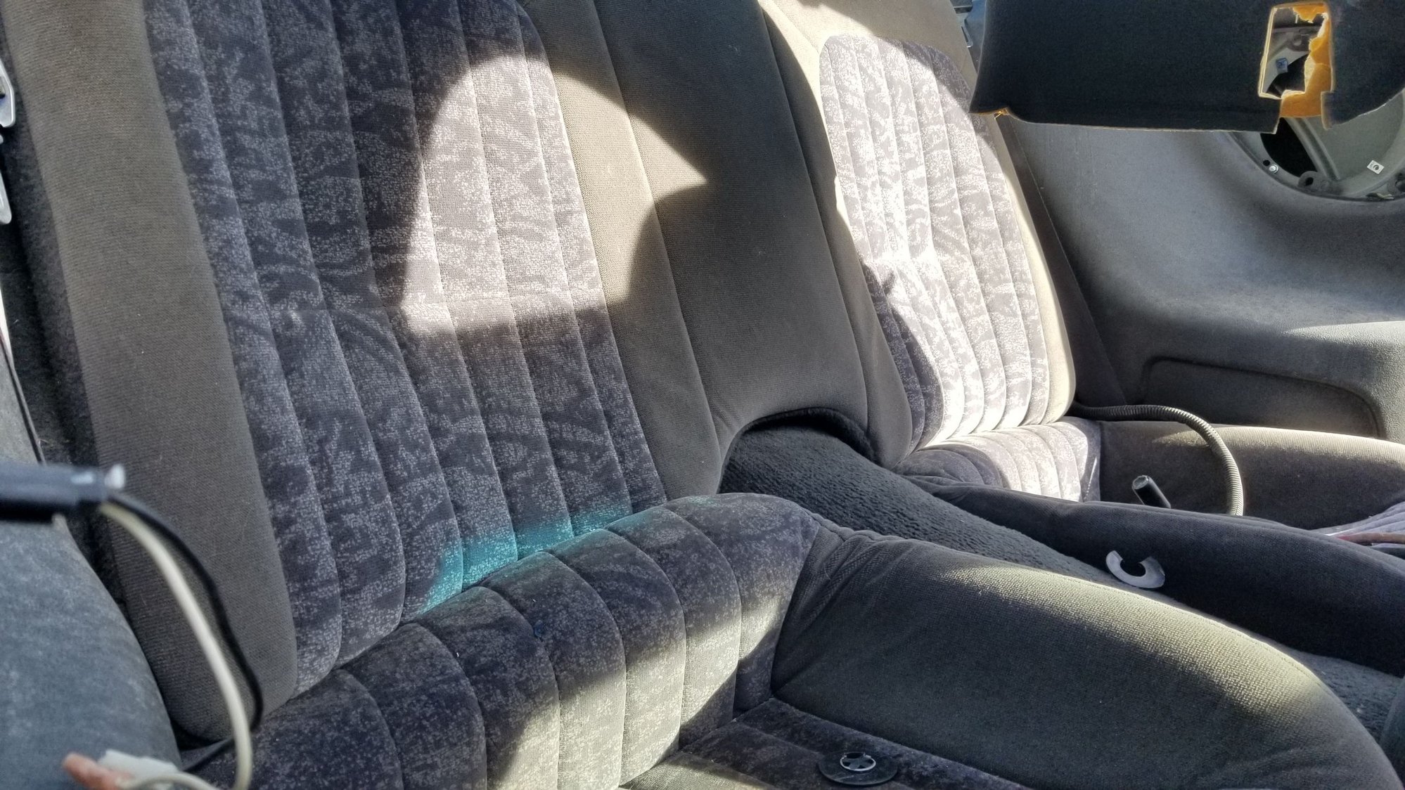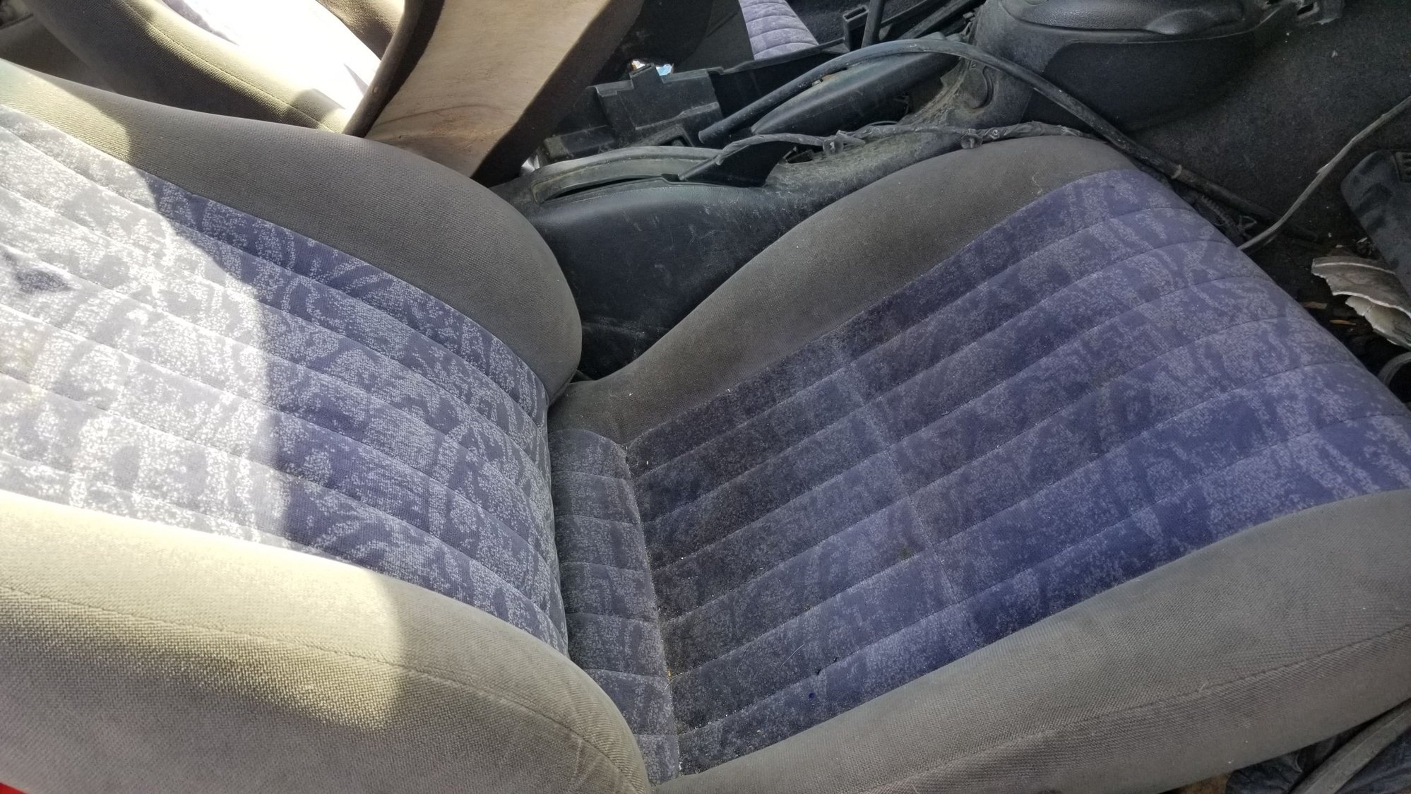 But this might give you an idea of something you might want to look for. For these, specifically, one seam on the driver's seat has popped, likely from sliding in and out of the car, but other than that, they're hardly worn at all, not even stained. For being in a junkyard car, STILL in a junkyard car, these are "immaculate." A thorough cleaning (to get the previous owner's smell out of them), repair the seam, fix or replace the electric switch cover panel, and these will be install-ready. The sun was freaking BRIGHT, so I could barely see what I was capturing in the phone's screen, but I got them pretty good.