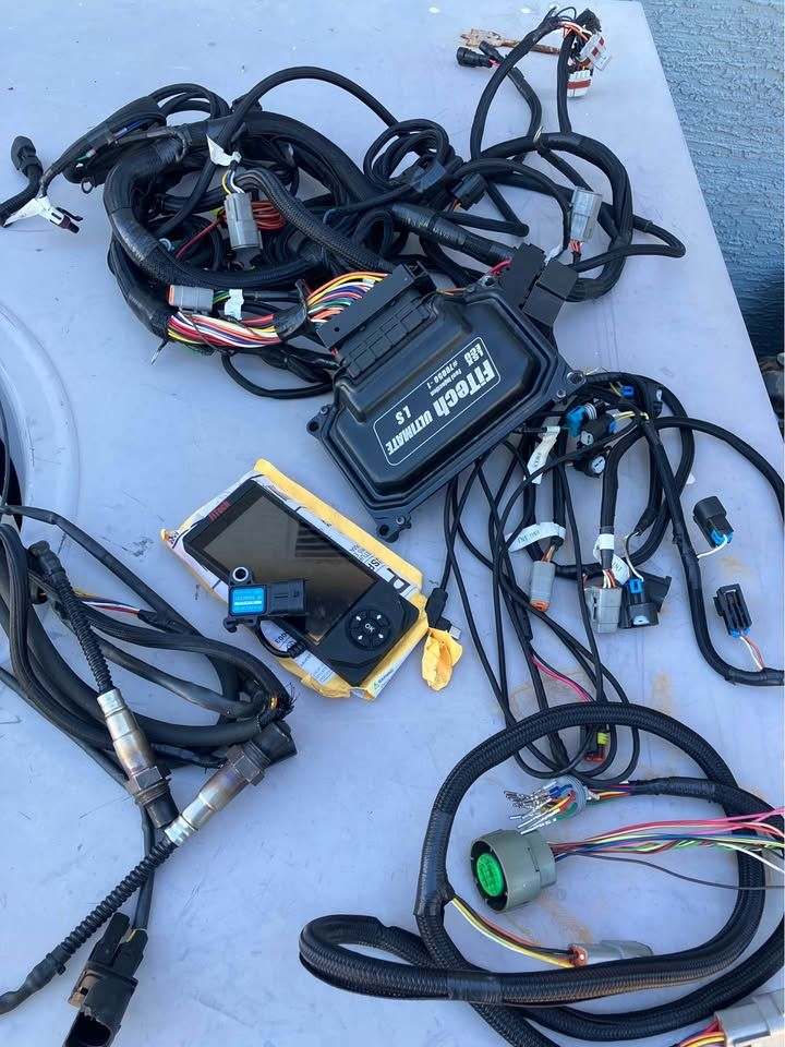 Comes with engine harness, which has some repairs from swapping firing orders and such, needs a cam sensor pigtail also, Comes with both o2 sensors, transmission harness which needs to be repinned to a new connector, connector included. Never bothered with it I run a t56, comes with screen, and brand new gm map sensor. Throw in some ev6 to multec adapters.