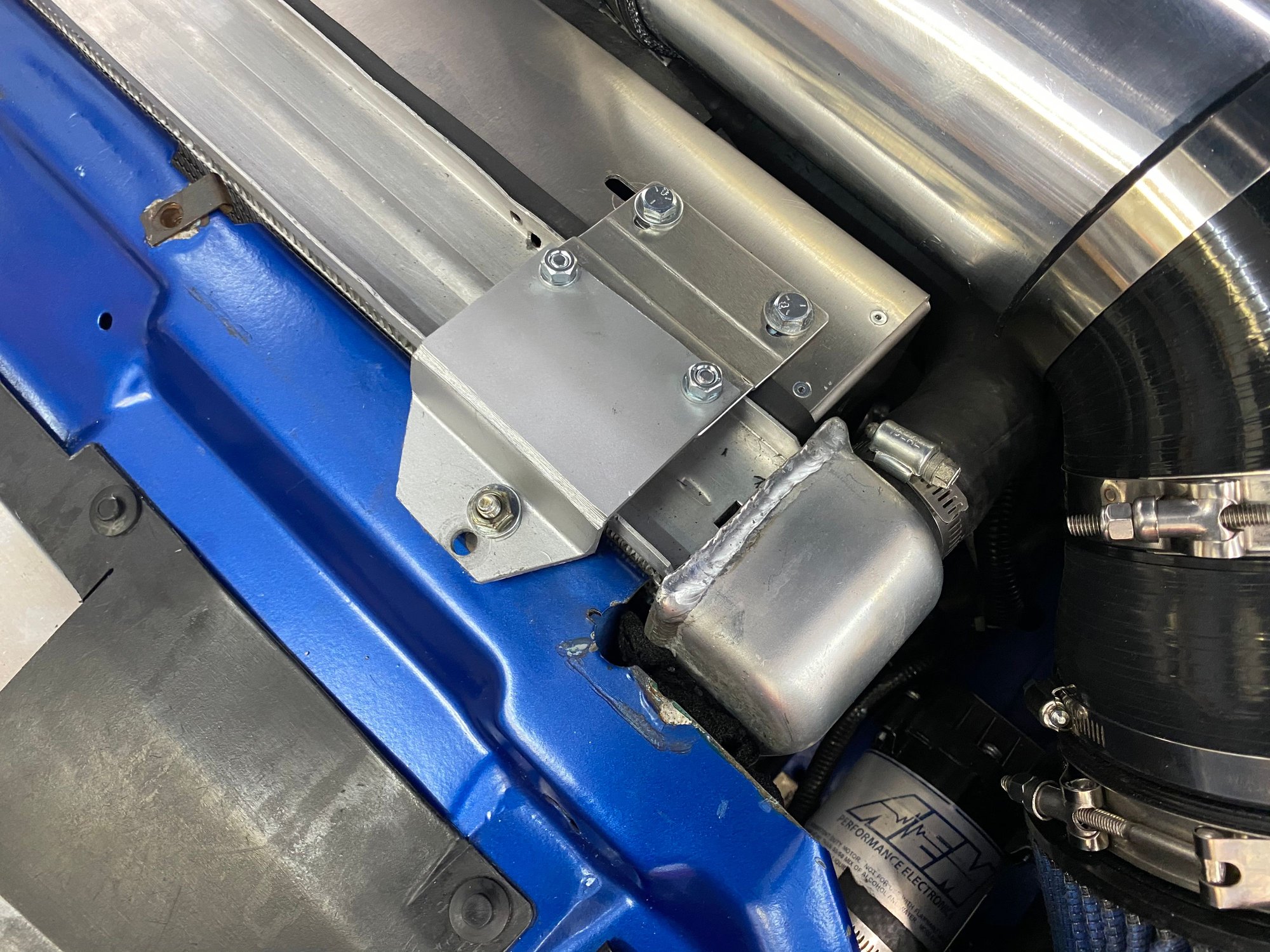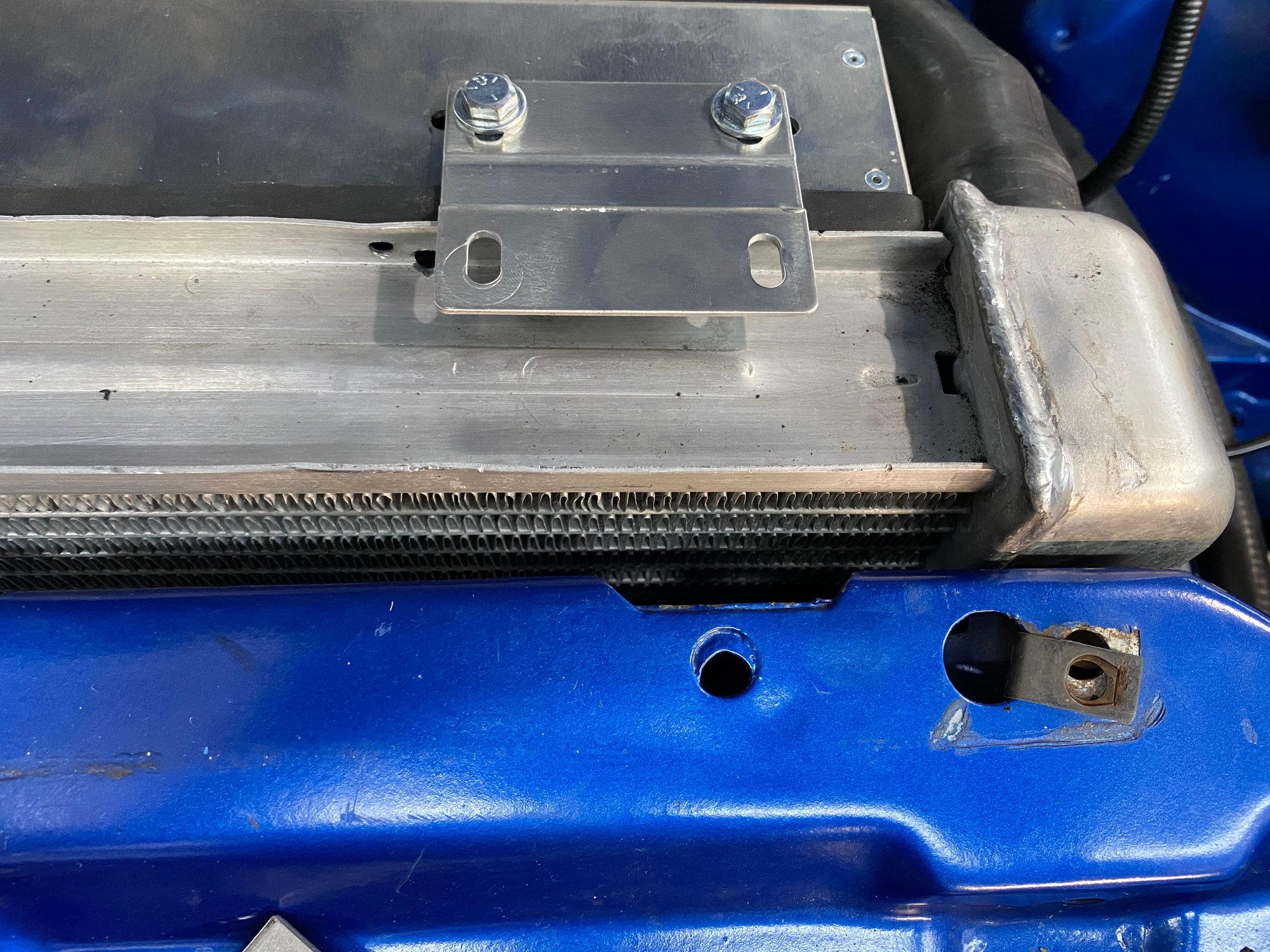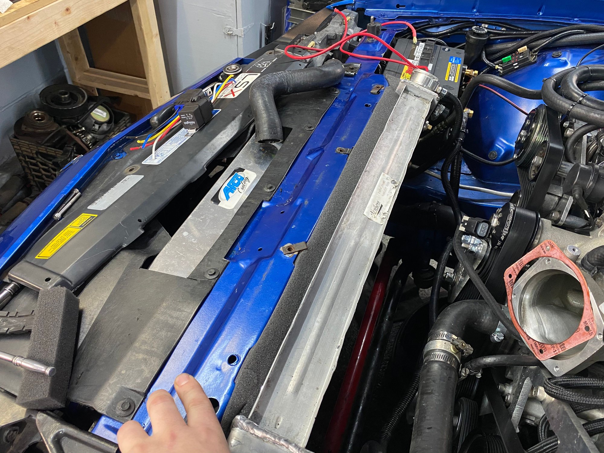 Had to make some brackets to hold the fans and radiator in place. This was long overdue anyway because the top of the radiator has been held in place with zip ties for the past 5 years. I just need to grab some short bolts to attach my bracket to the bracket on the fan shroud, plus a coat of paint and they’ll be done. I was able to utilize existing holes in the core support to install a stud for the brackets to attach to. Also with the top plastic re-installed you can’t even see the brackets. Im probably gonna drill a hole in it and use the bolt for my bracket to hold it in place. Wiring should be done tomorrow.