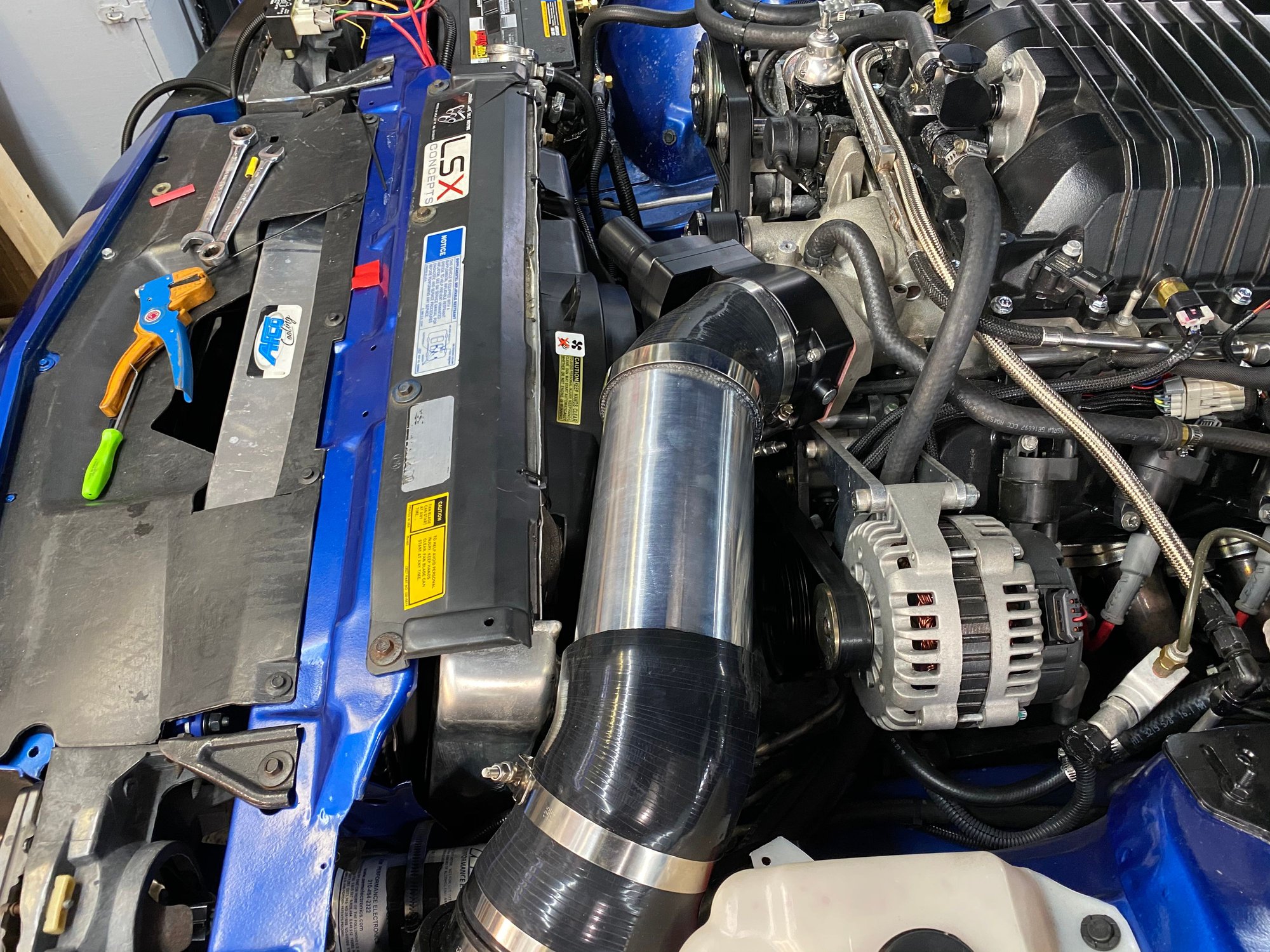 I'm probably going to notch the upper support so I can tip the radiator forward a little more. Im also going to try cutting the 4 to 5 inch coupler to angle in towards the alternator/upper hose area more. I have a 4.5 on their now, but the 5 inch piping I have is carbon fiber and I couldn't find any in 4.5. That aluminum gets hott compared to my old intake.