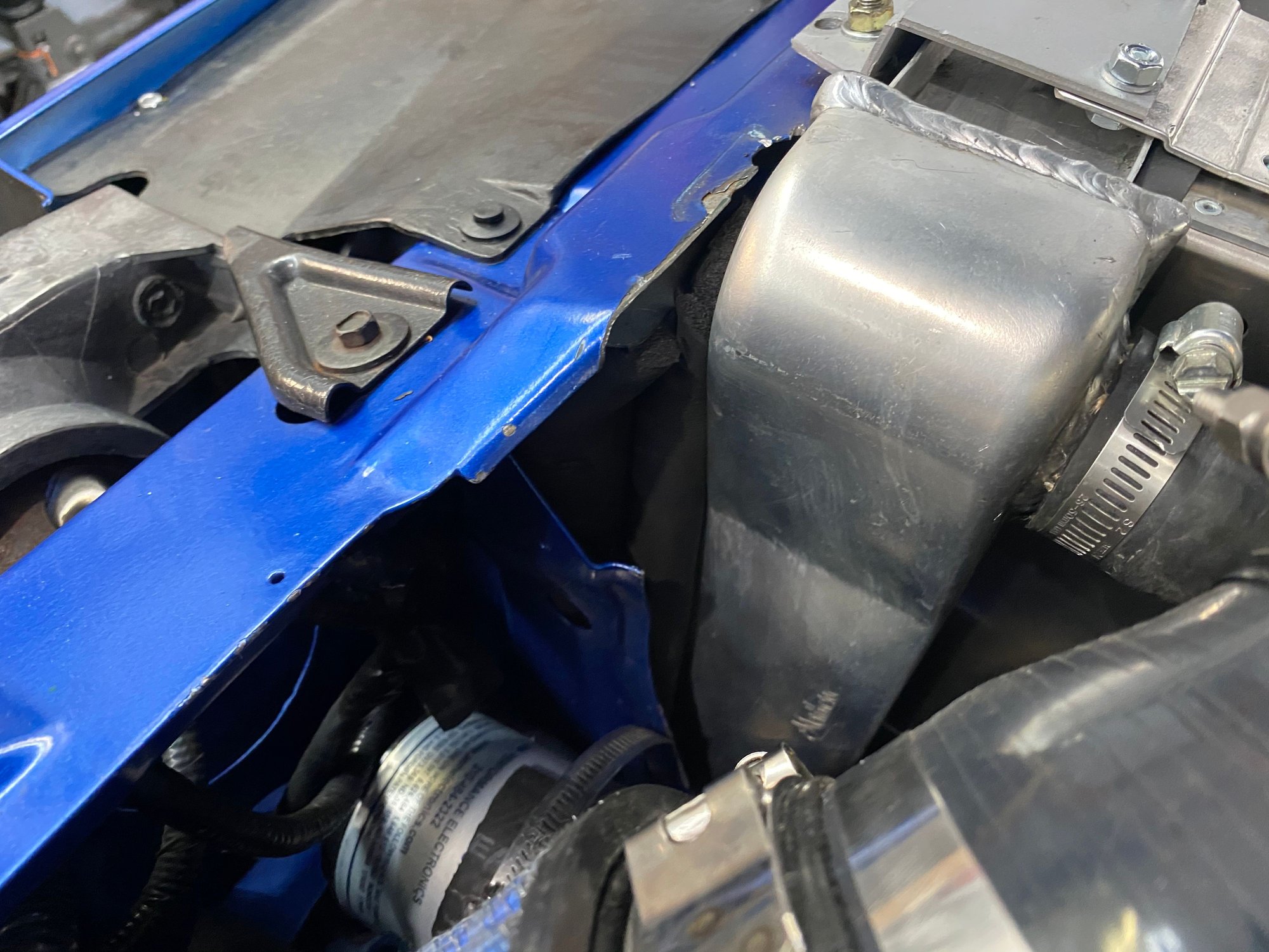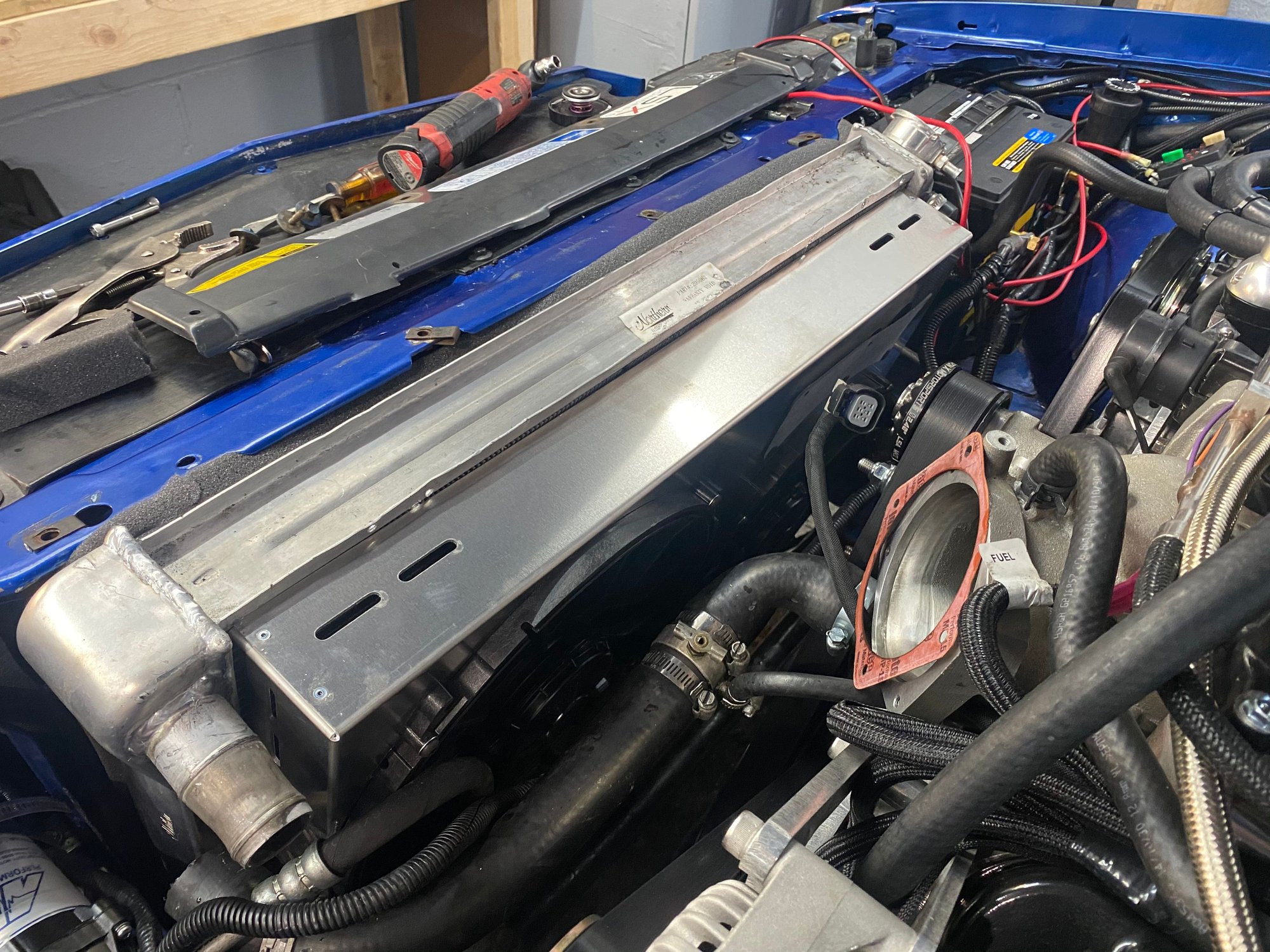 I also had to cut notches in both side of the core support to fit my intake. The shroud is so thick I couldn’t fit the elbow on the throttle body. Even now its rubbing slightly so I’ll have to cut it out completely and do something tubular, or go down to a slightly thinner radiator. I think the dual pass 3 core champion is slightly thinner than my summit.
