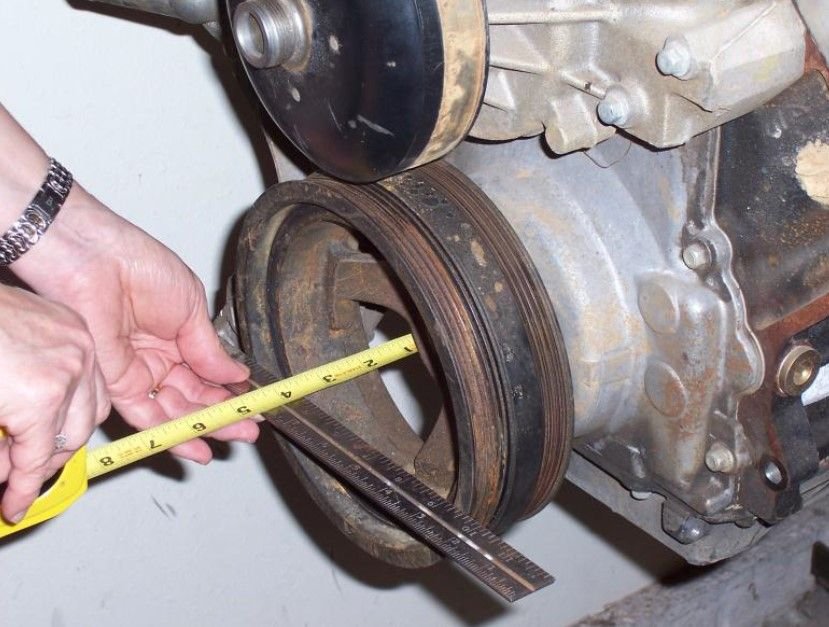 Whether you are building your combo from scratch or installing a core from a wrecker you will need to know what FEAD spacing you have or want. GM uses three different spacing groups that each encompass various vehicle specific configurations. Below is an image that shows how to determine what spacing configuration you have and or want. The image is a side view of the engine focusing on the front engine timing cover and harmonic balancer. Placing a straight edge across the balancer and measuring the depth from the straight edge to the surface of the front engine timing cover will let you know what spacing you have. If you are building from scratch, the chart will show you the spacing each GM platforms was built with.
