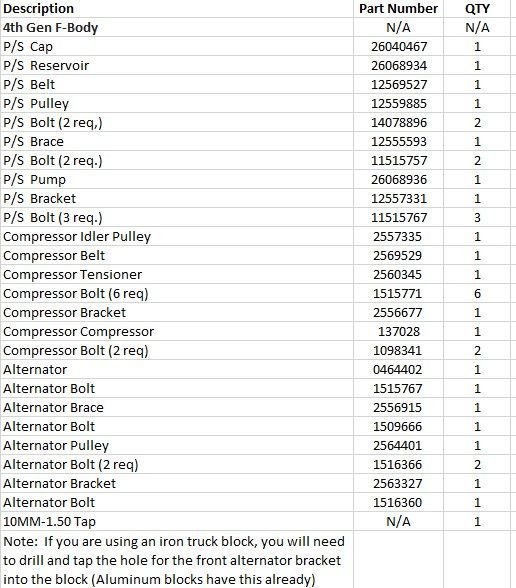 Hood clearance is another item that may limit your selections. The truck and blower (LSA, LS9) FED systems are much taller than the OEM 3rd gen set-up. If you have a firebird, those problems are only exacerbated. For this reason, Most folks ditch and or reconfigure (easier to relocate left and right than up and down) the truck accessories. The best FEAD systems for height are the CTSV, 4th gen , and Vette setups.