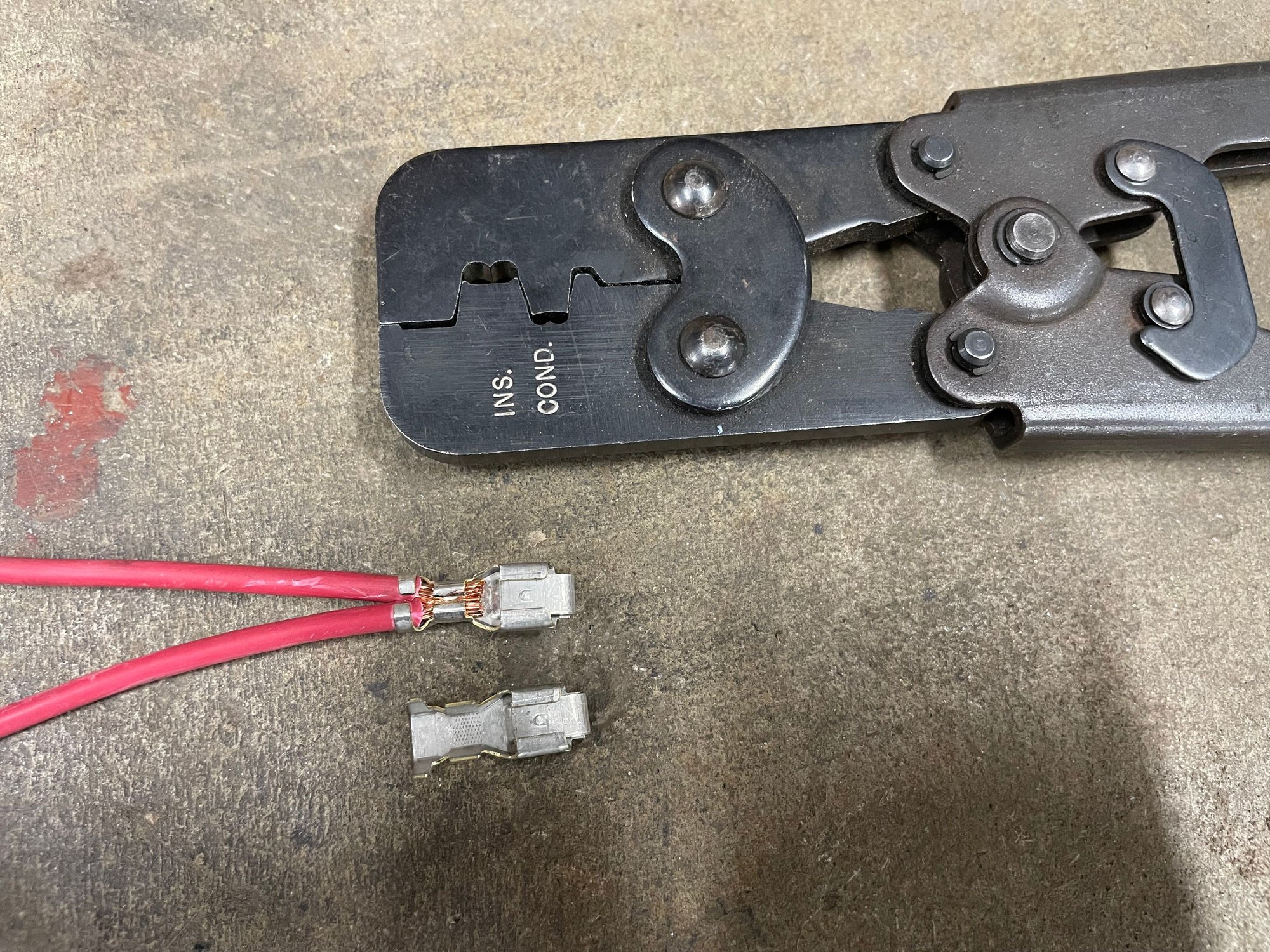 Using the T-15 double crimper. Most commonly used on series 56/59 terminals in AAW chassis harness kits, but I've seen a couple ring terminals using the same basic crimp method. 59 series are still used for all 3rd gen headlight bulbs. Engine harness uses are extremely limited